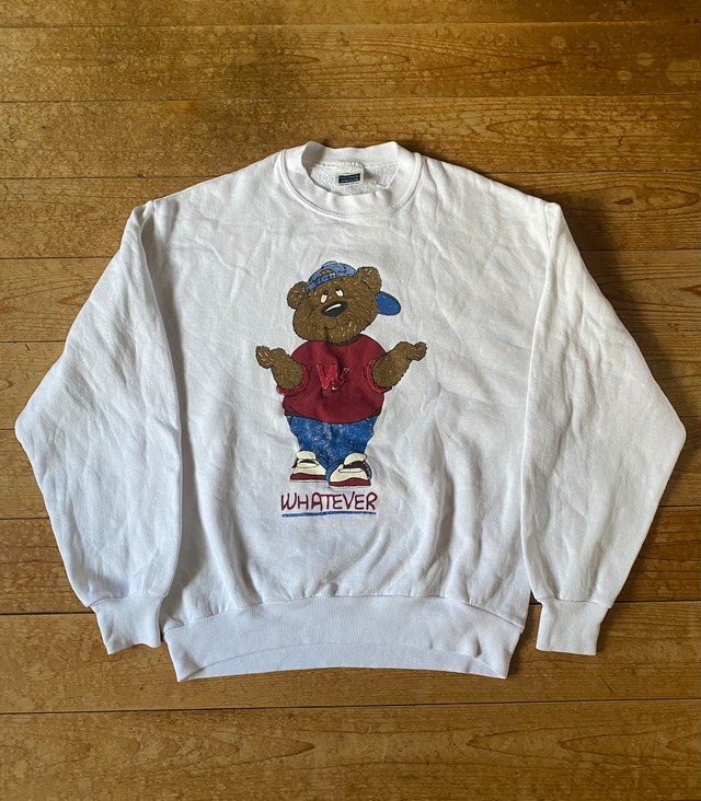 90's USA製 ベアープリントスウェット WHATEVER 古着 熊 ホワイト M トレーナー