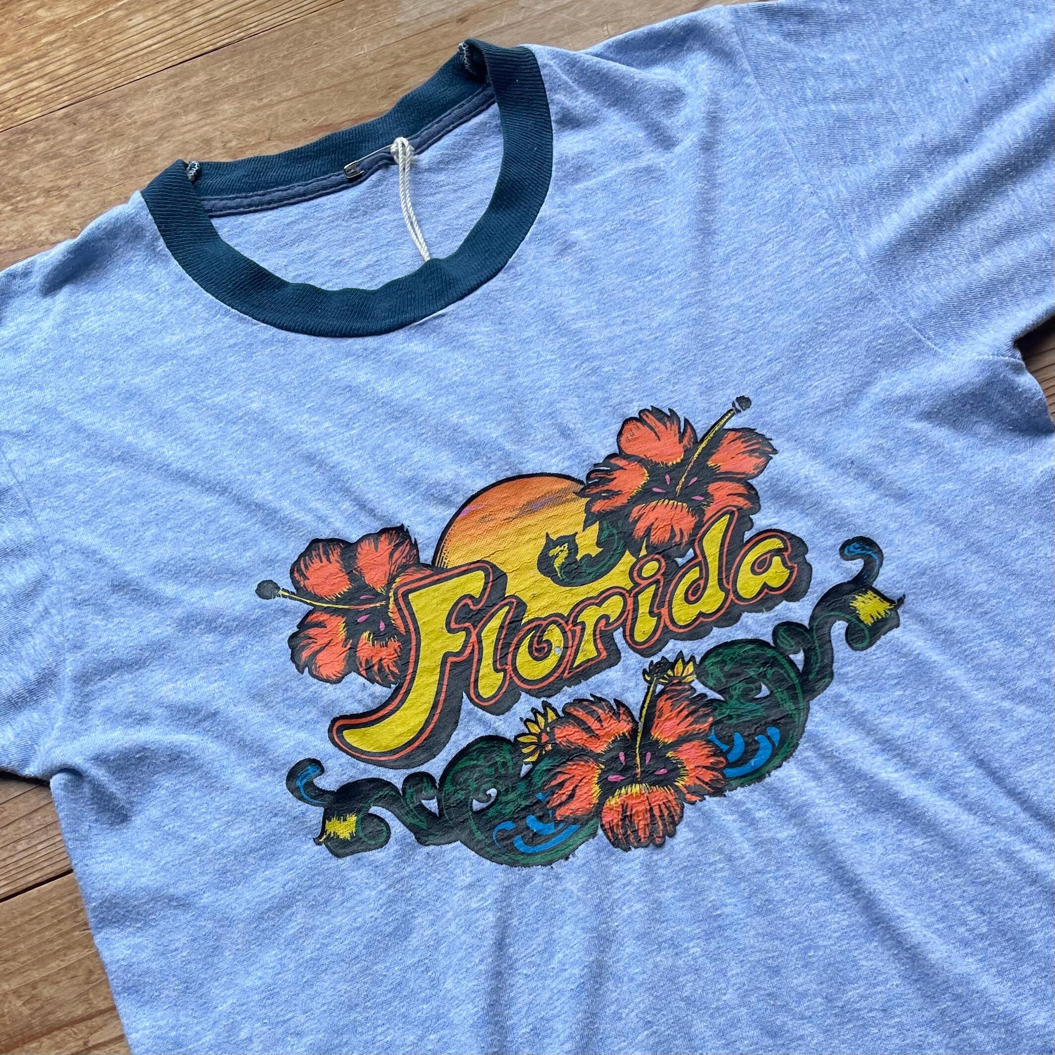 70's vintage Florida リンガーTシャツ 古着 フロリダ ハイビスカス サックスブルー USA