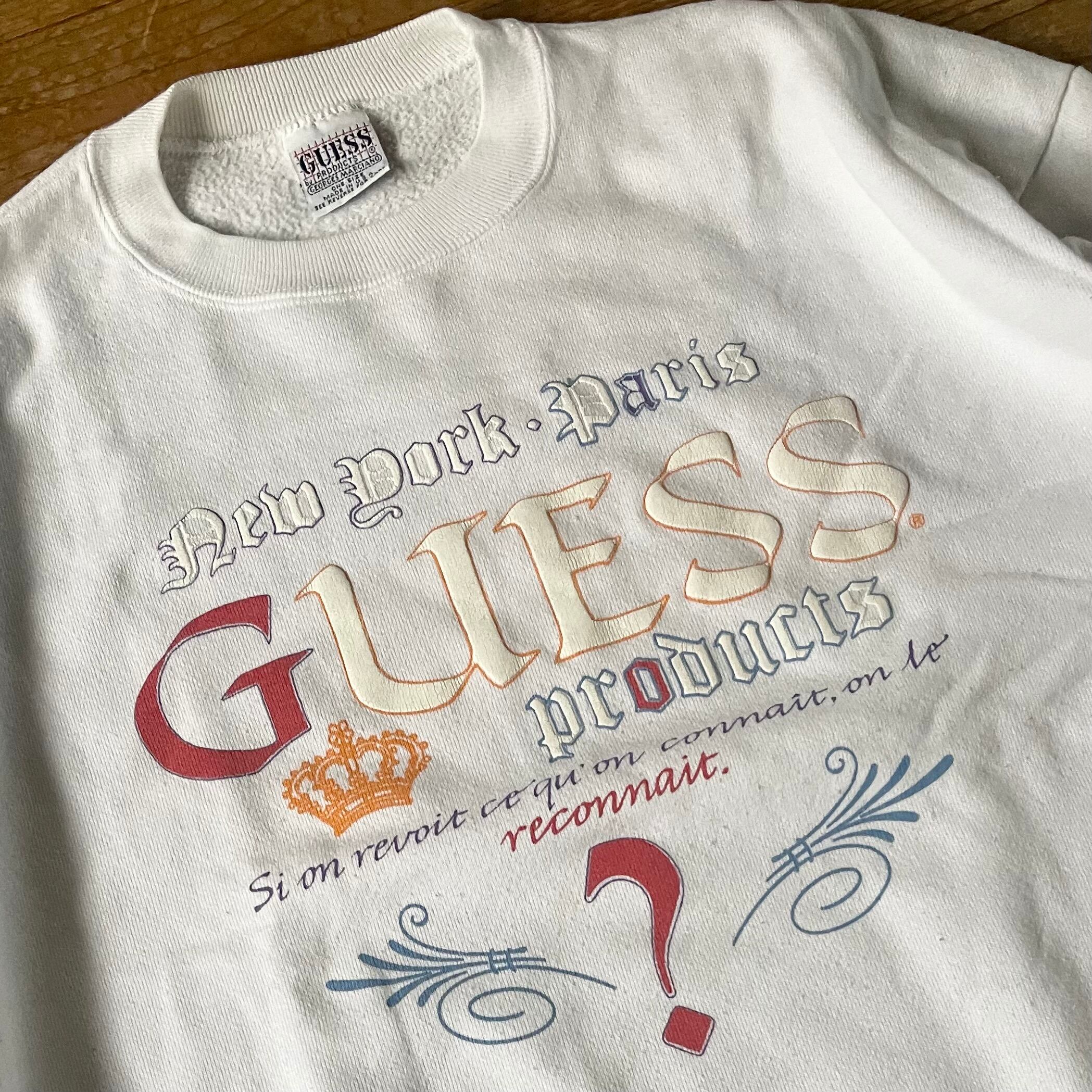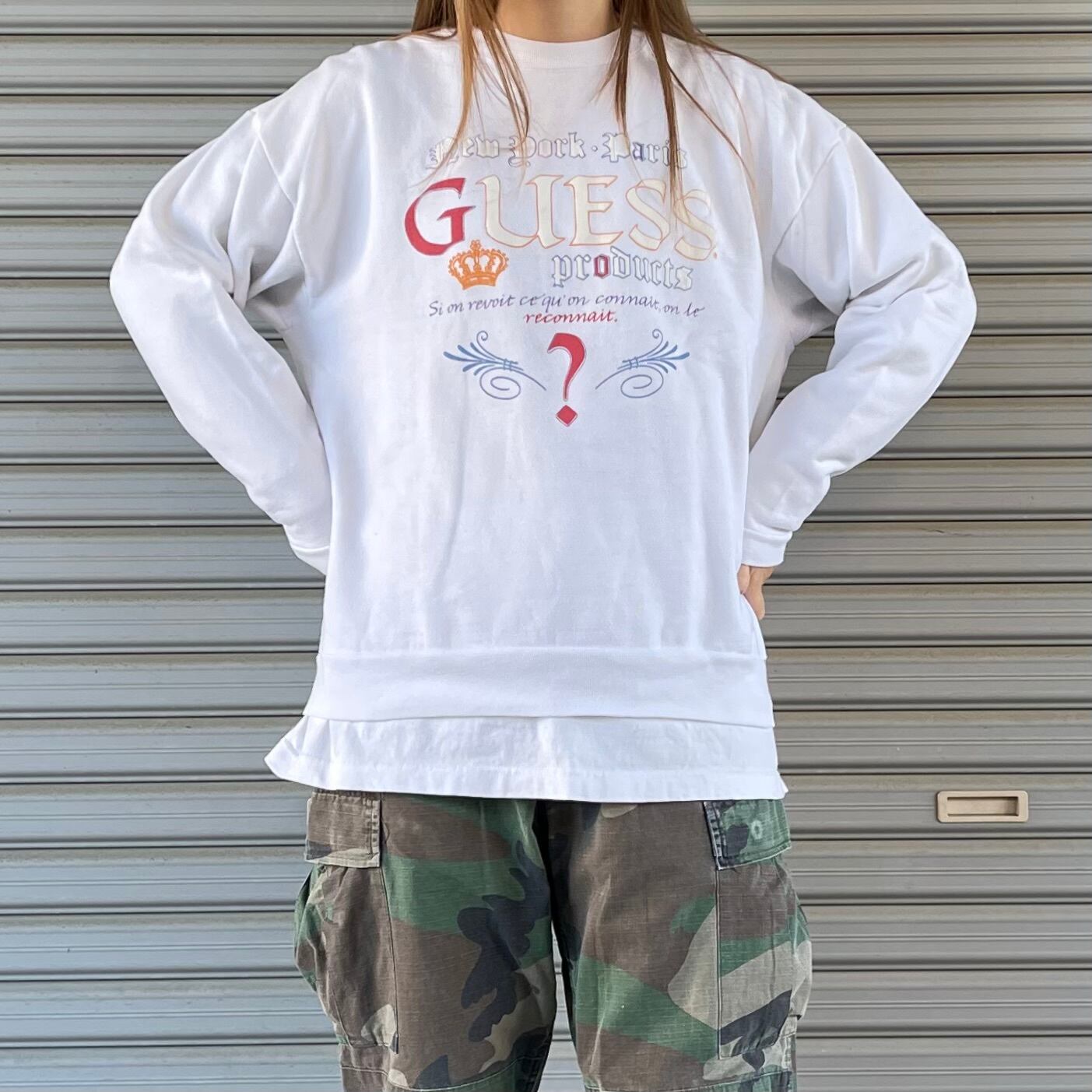 90's USA製 GUESS foam print sweat. 古着 発泡プリントスウェット シングルステッチ ホワイト メンズ レディース 白