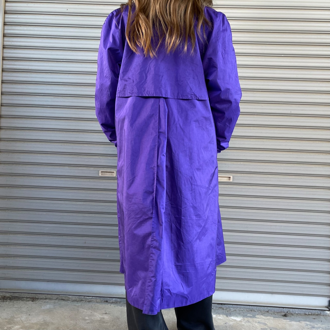 パープルカラーのロングステンカラーコート。