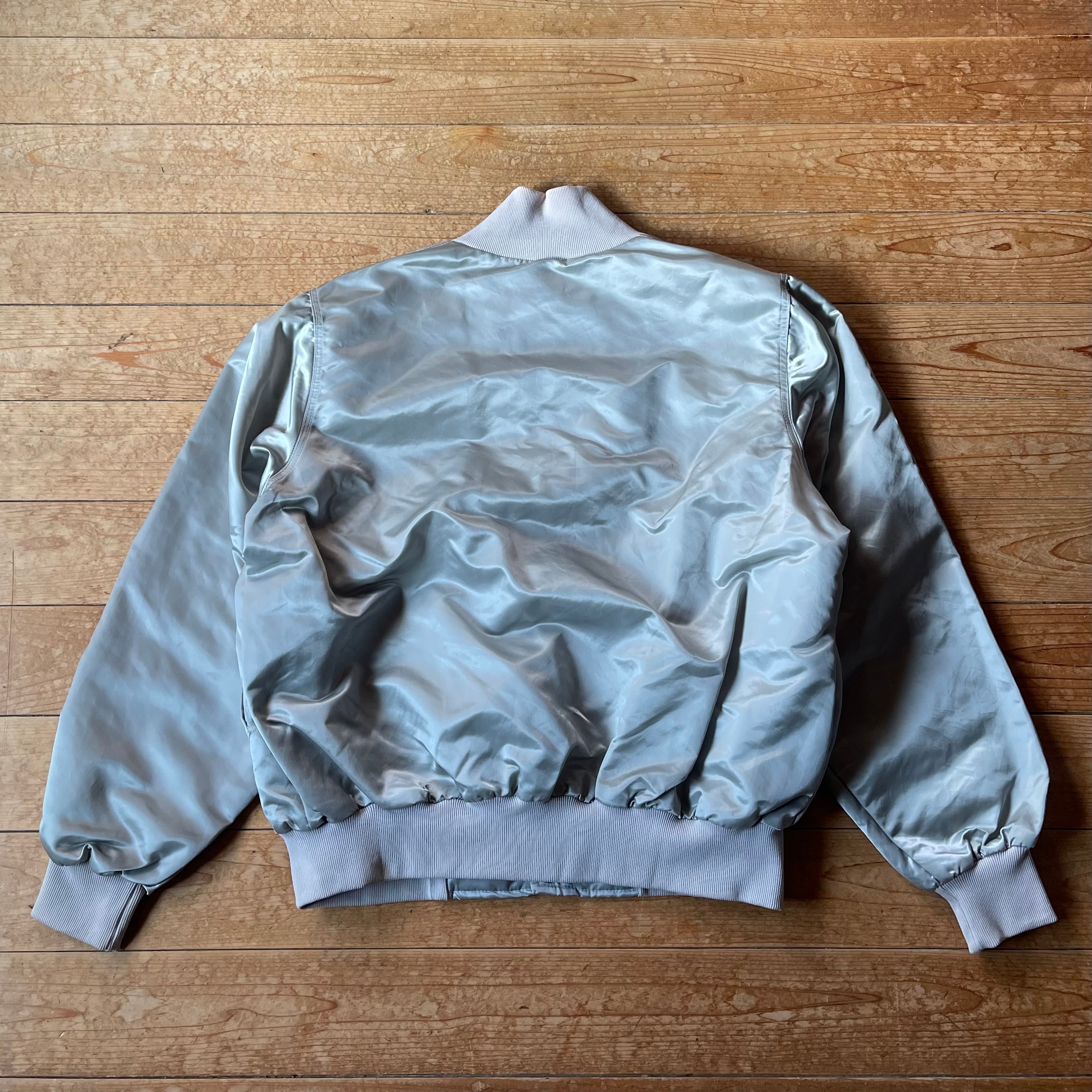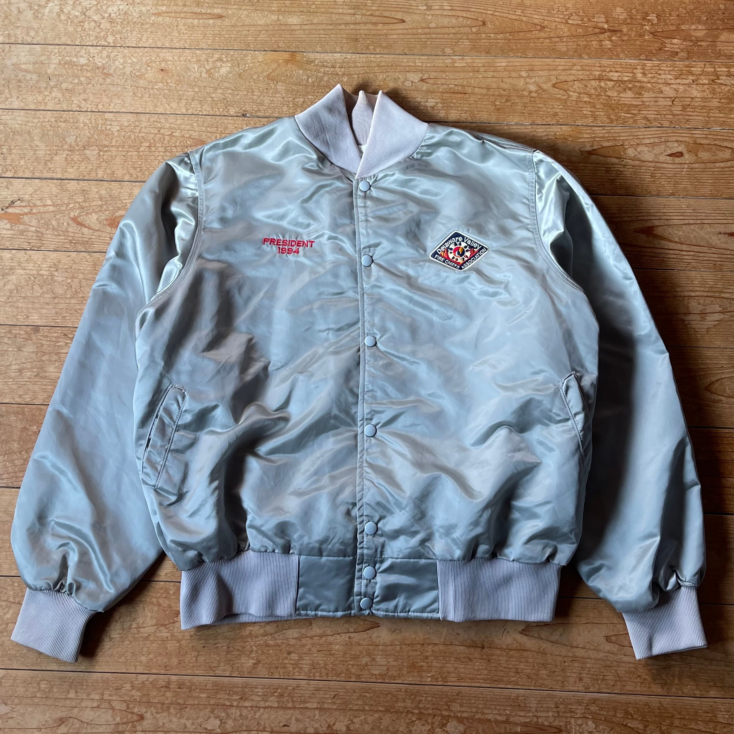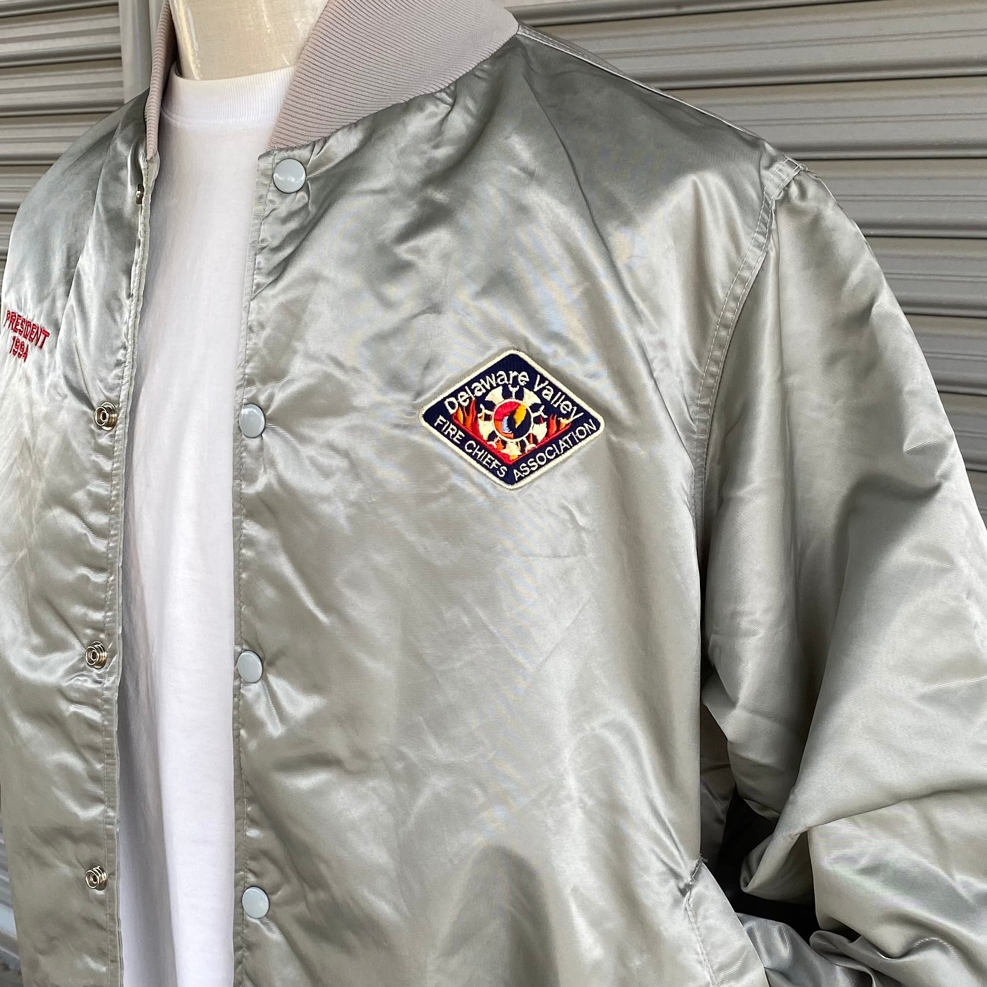 90's Delaware Valley Fire chief association nylon stadium jacket. 古着 ナイロンスタジャン デラウェア州 シルバー XXL アウター