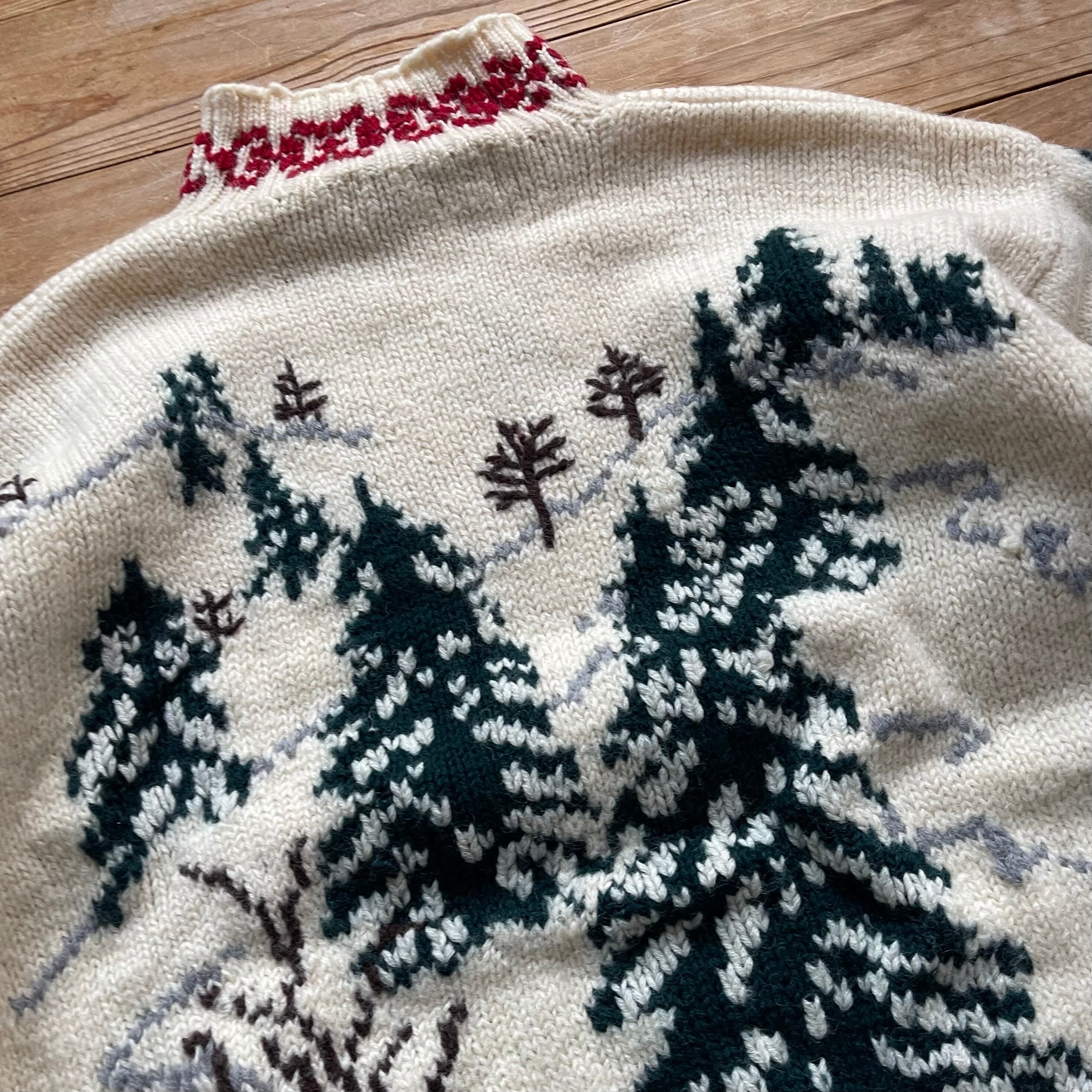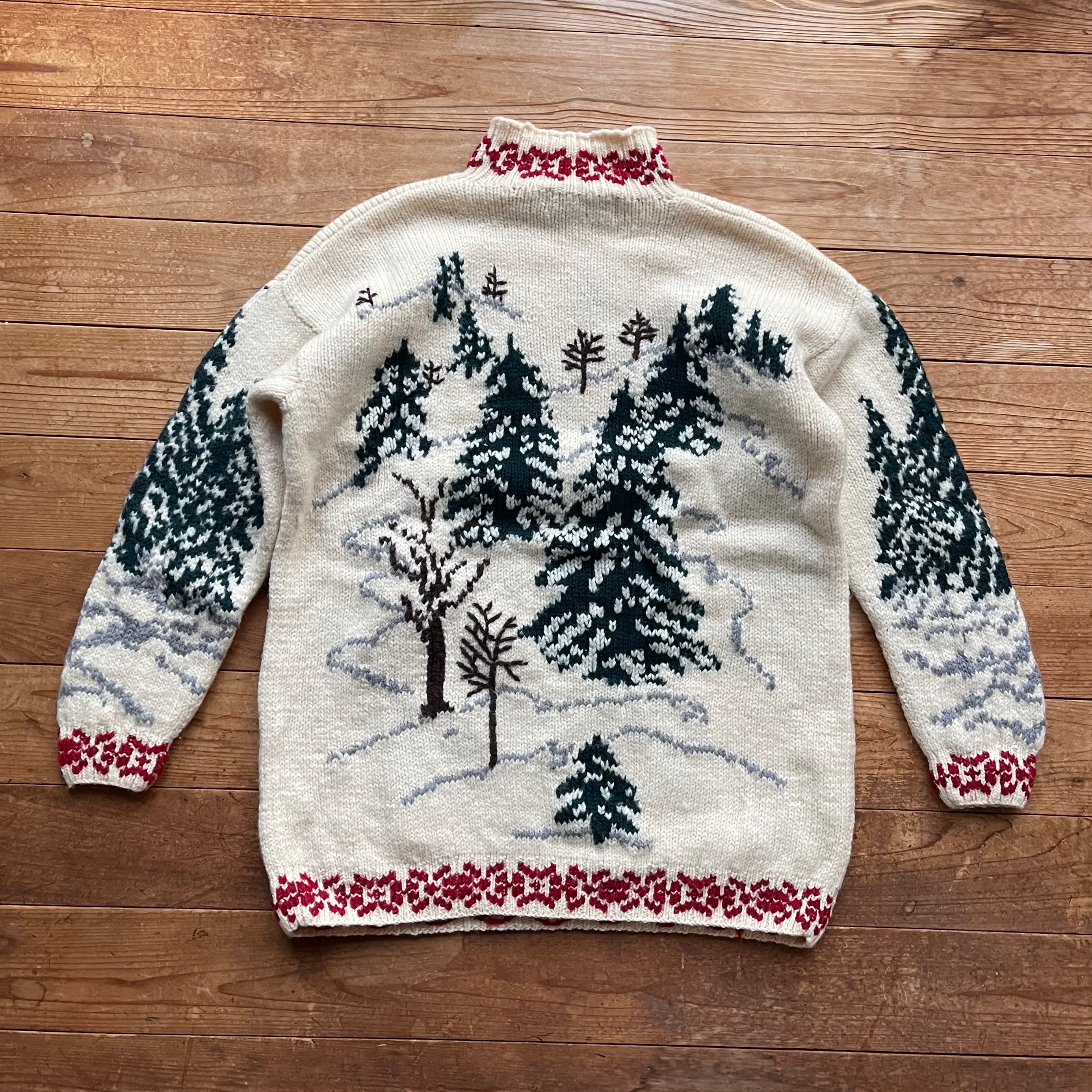 90's All Week long Nordic Design Knit. 古着 ノルディック 総柄ニット もみの木 セーター ホワイト 白 M