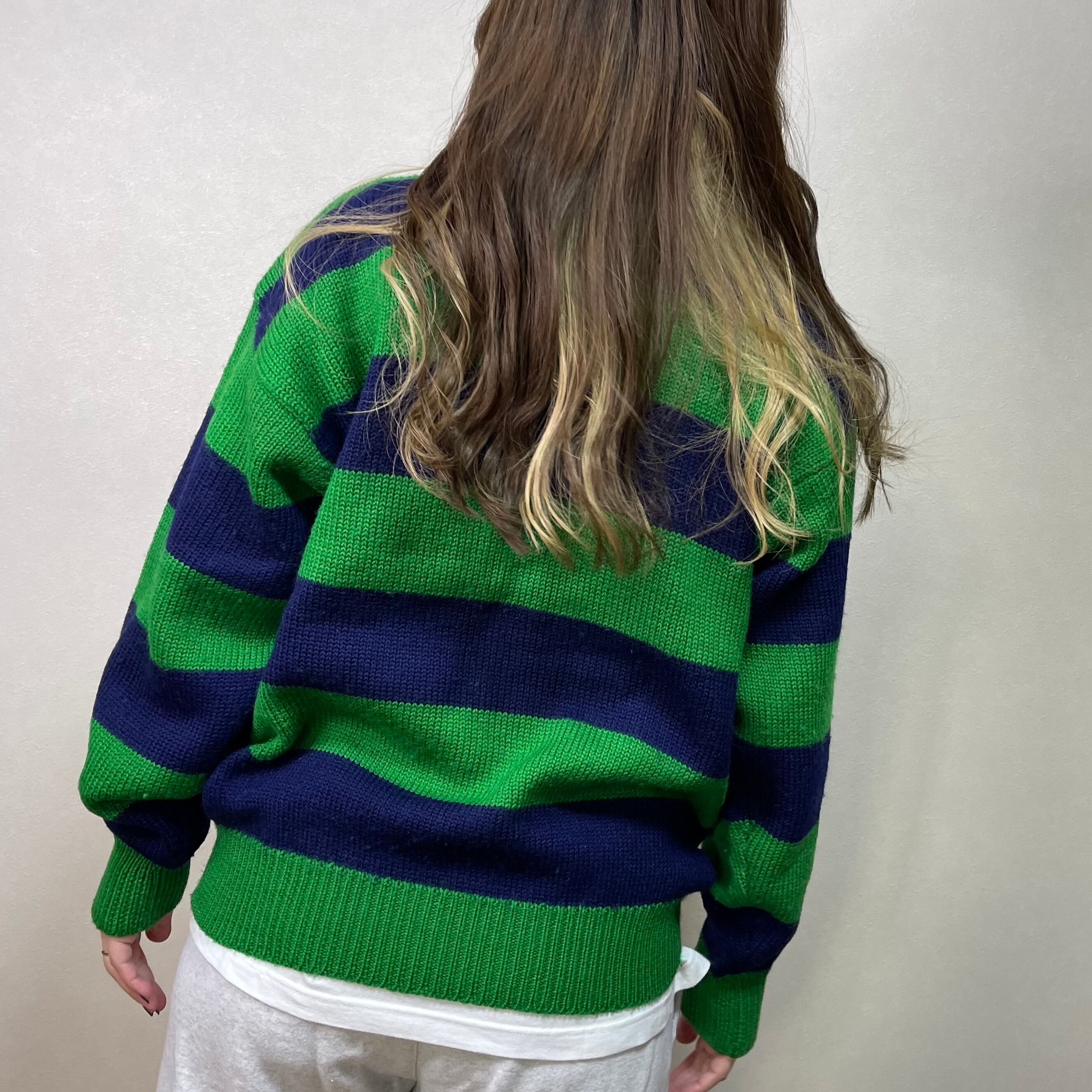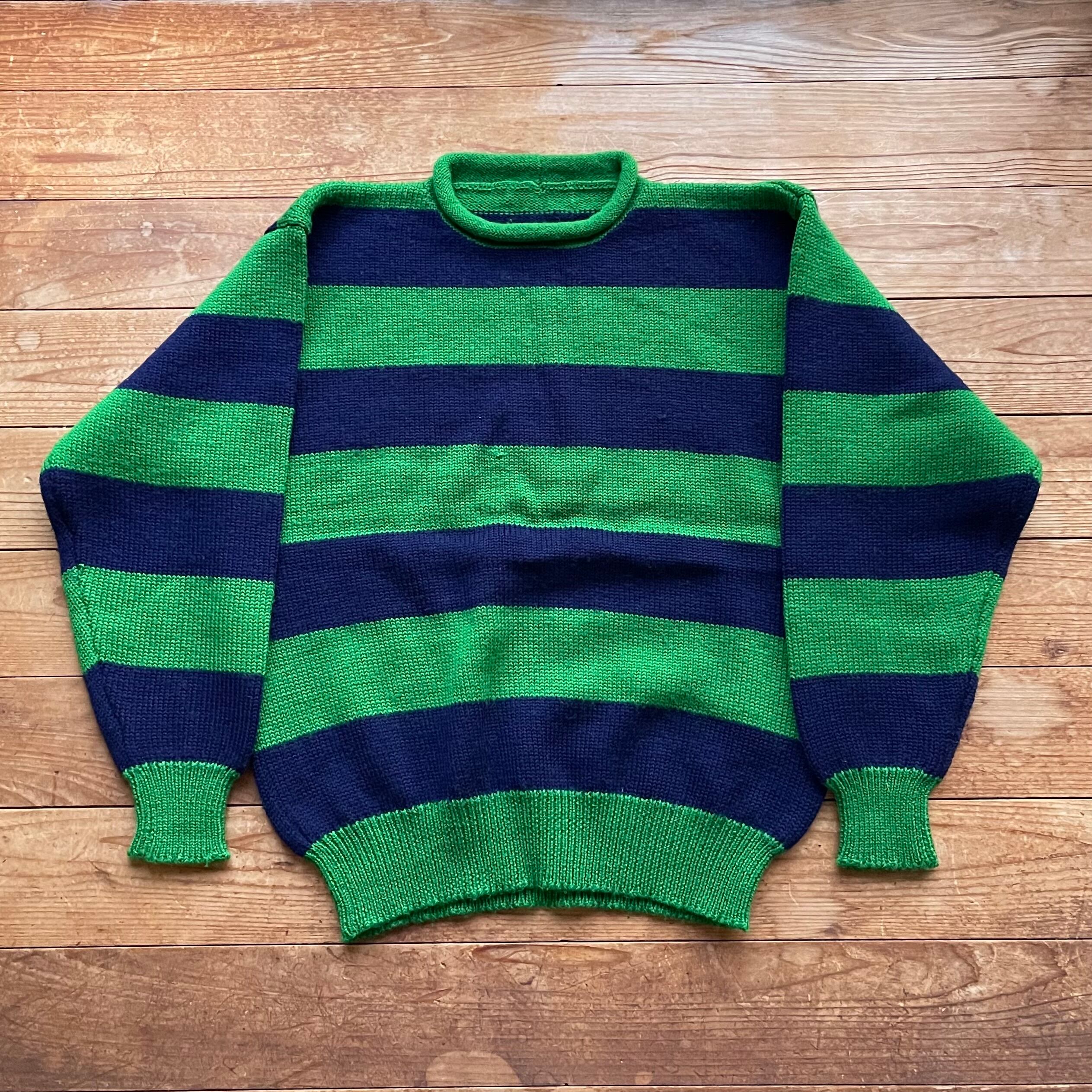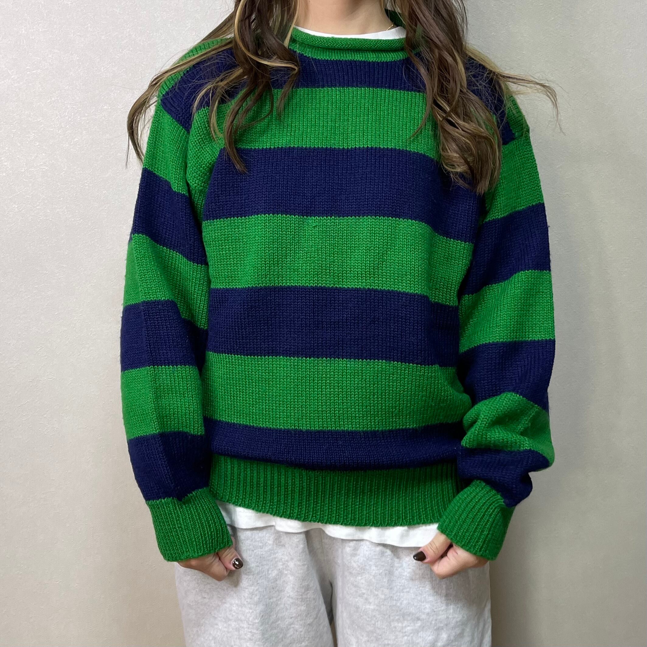 90's wide border roll neck knit. 古着 ワイドボーダーニット ロールネックセーター グリーン ネイビー 緑