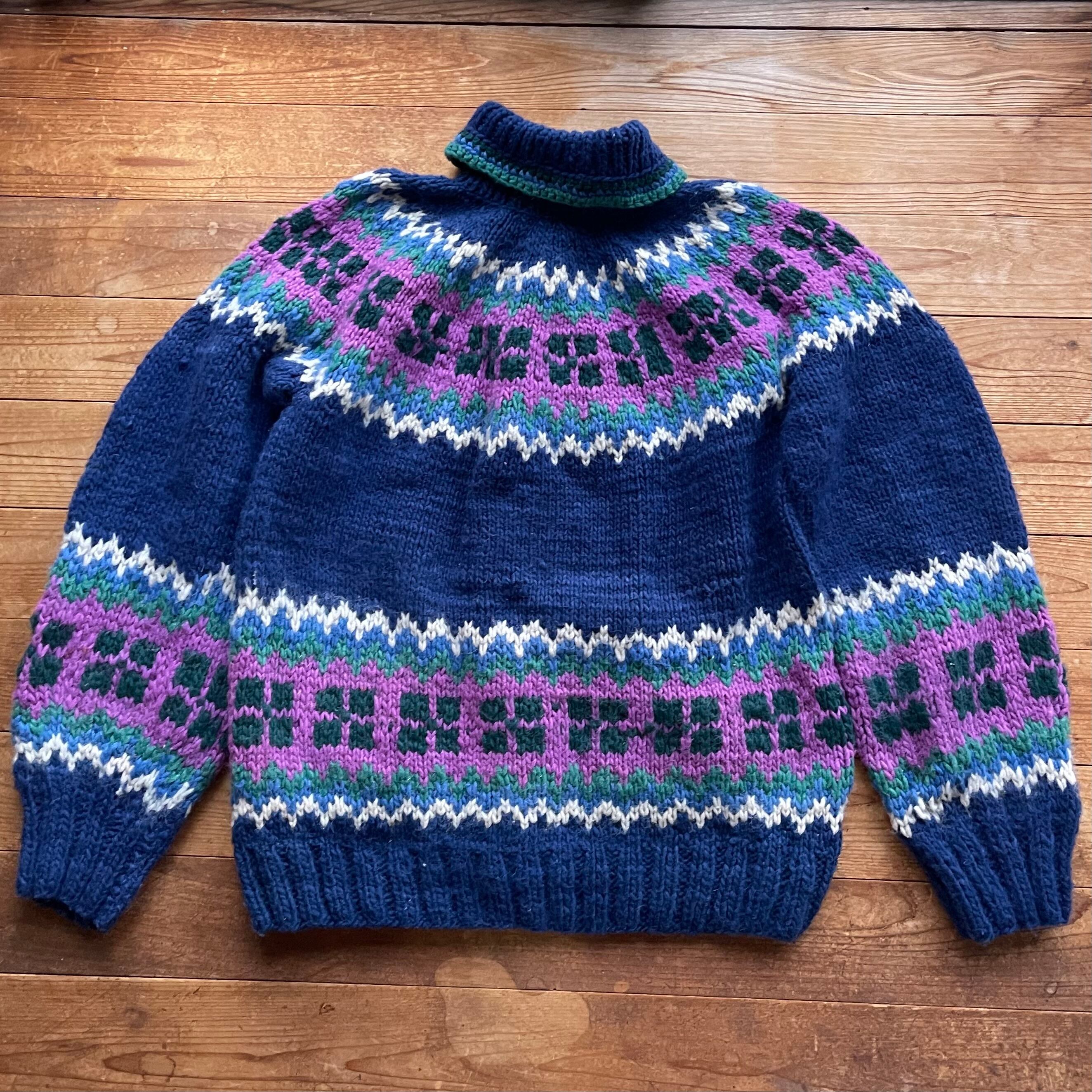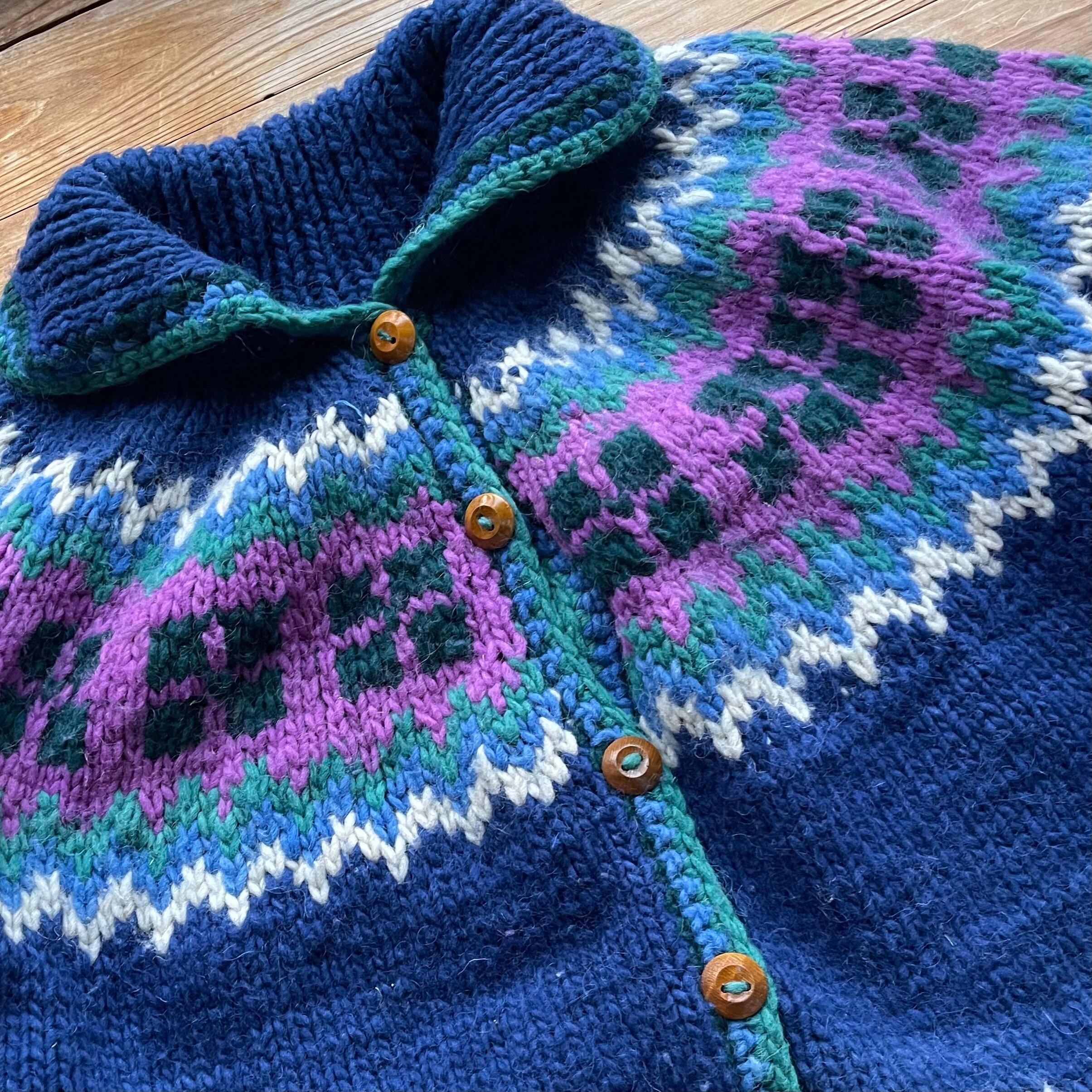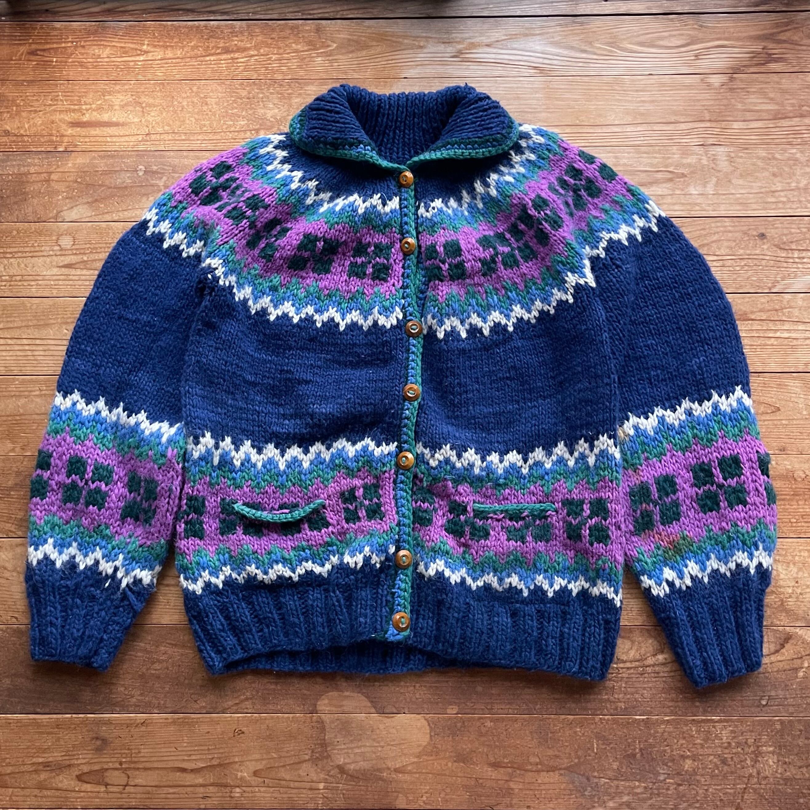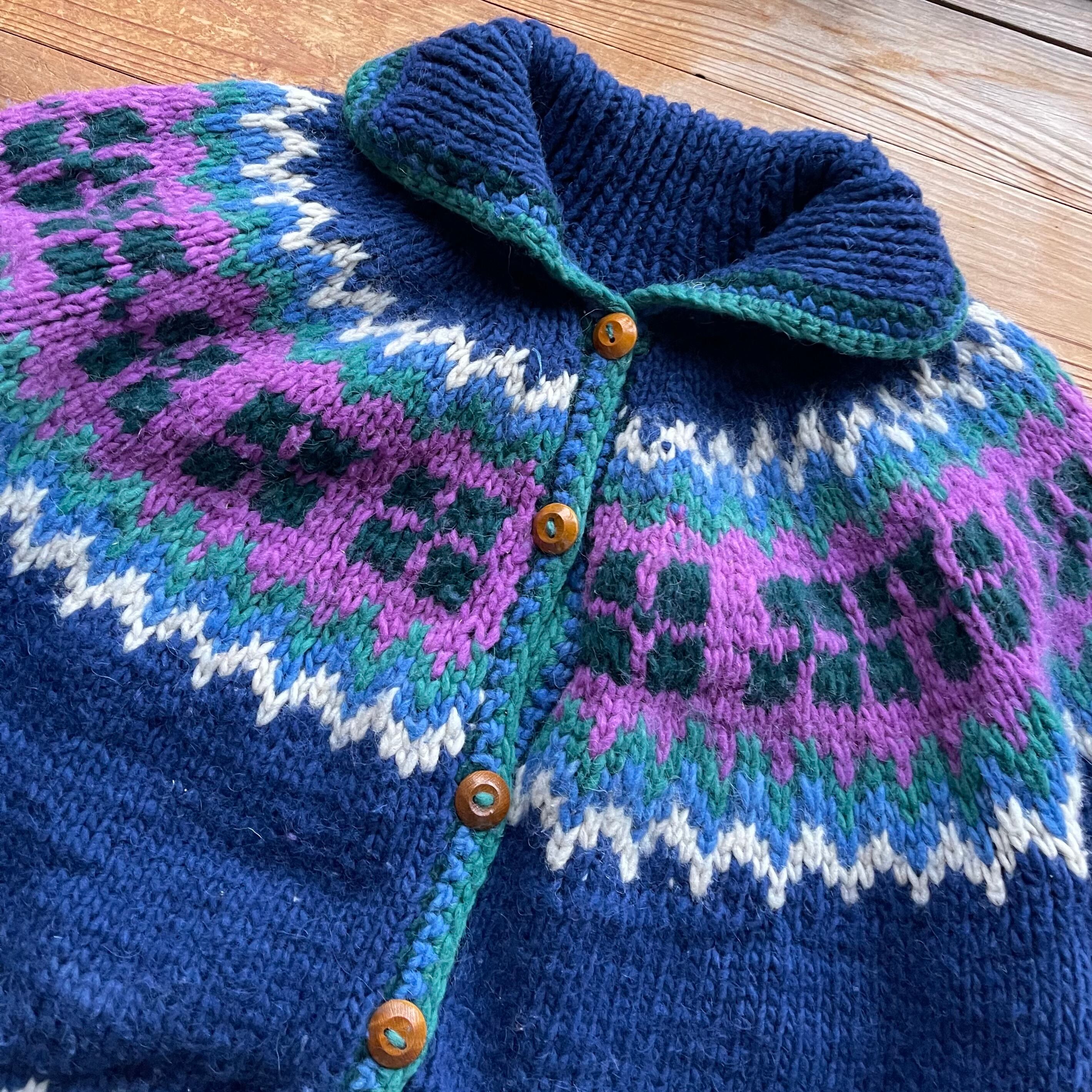 80's Ecuador knit cardigan. 古着 エクアドルニット カーディガン カウチンセーター 襟付き ブルー 青