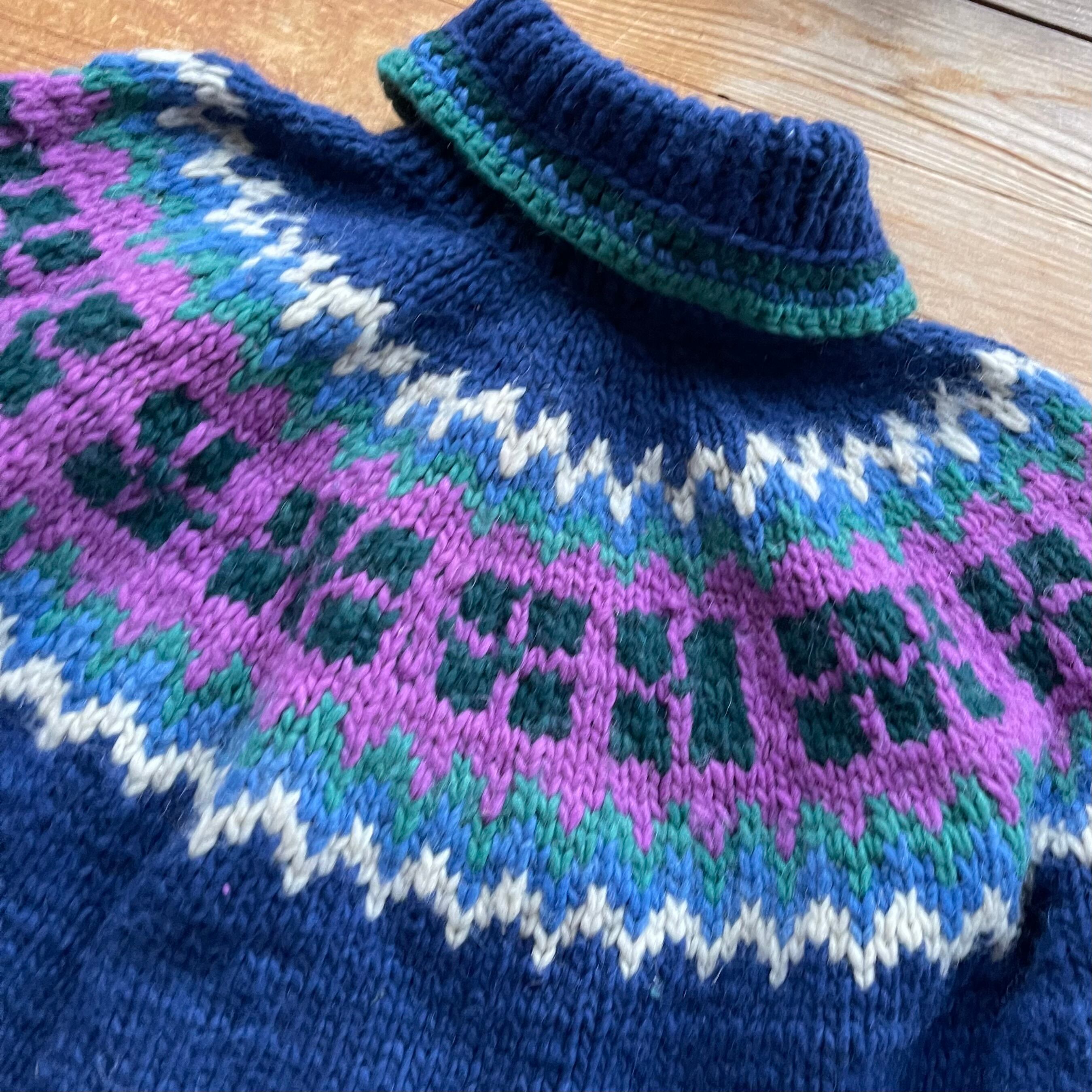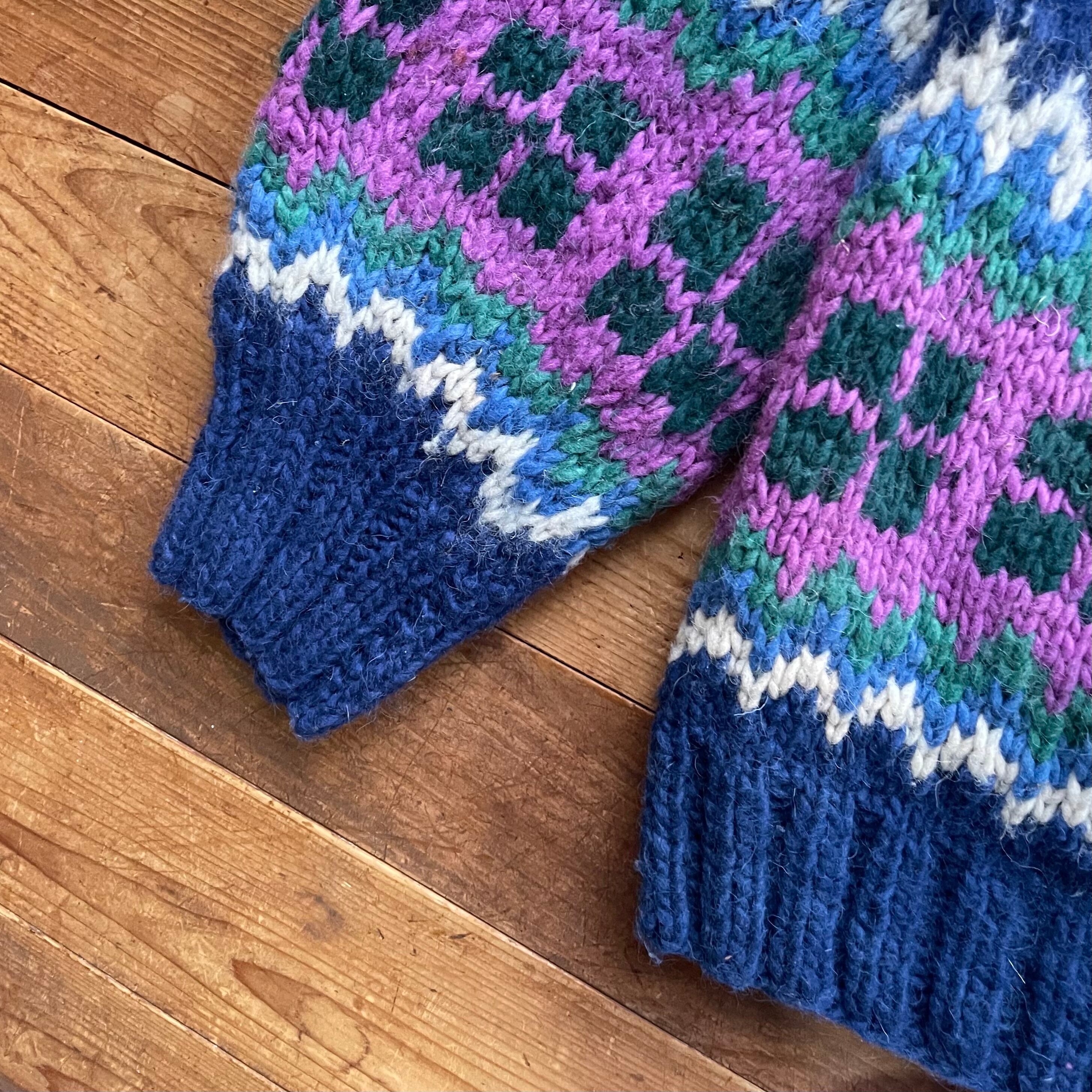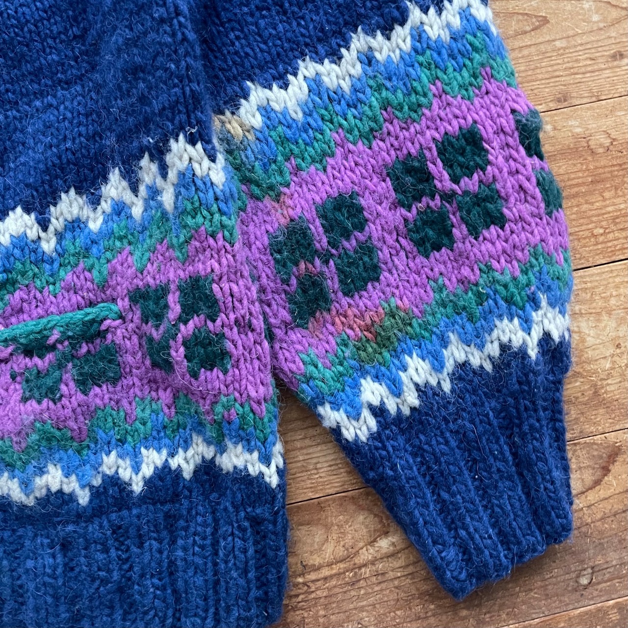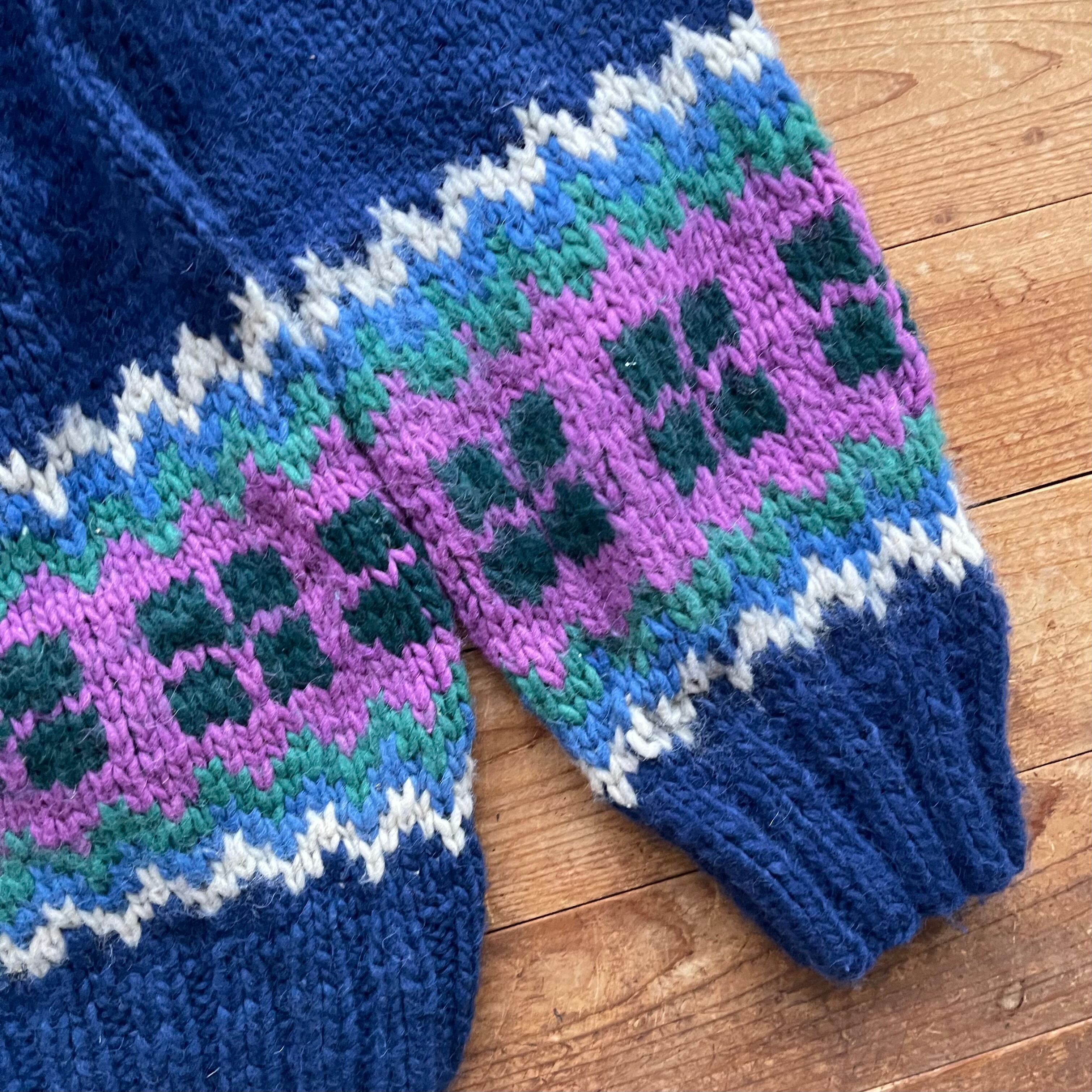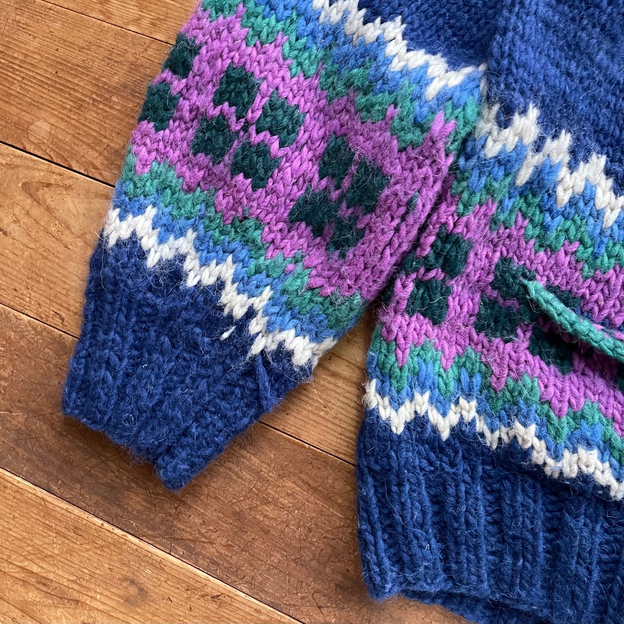 80's Ecuador knit cardigan. 古着 エクアドルニット カーディガン カウチンセーター 襟付き ブルー 青