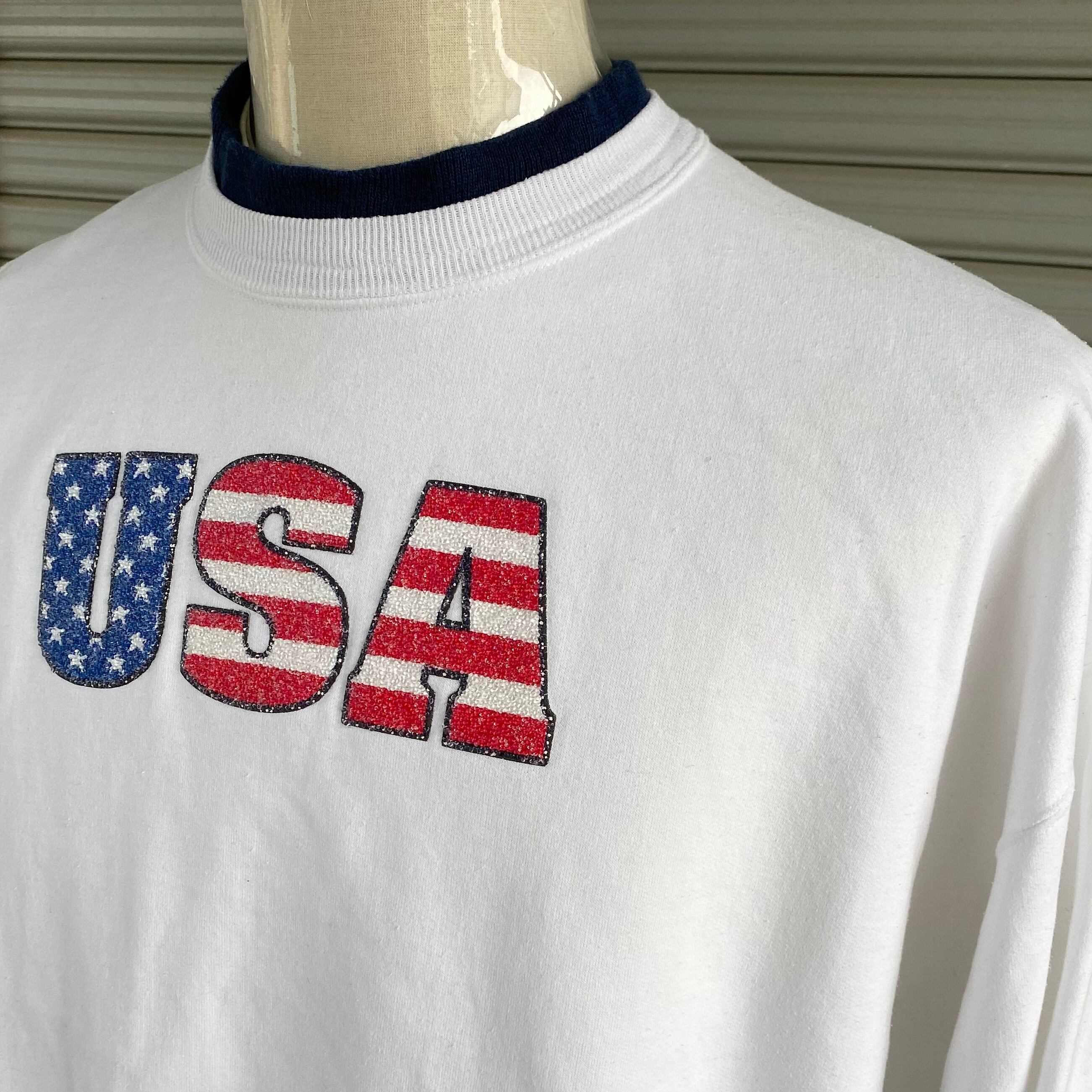 90's USAラメデザインスウェット 星条旗 リンガー アメリカ製 ホワイト トレーナー メンズ レディース ビッグサイズ 古着