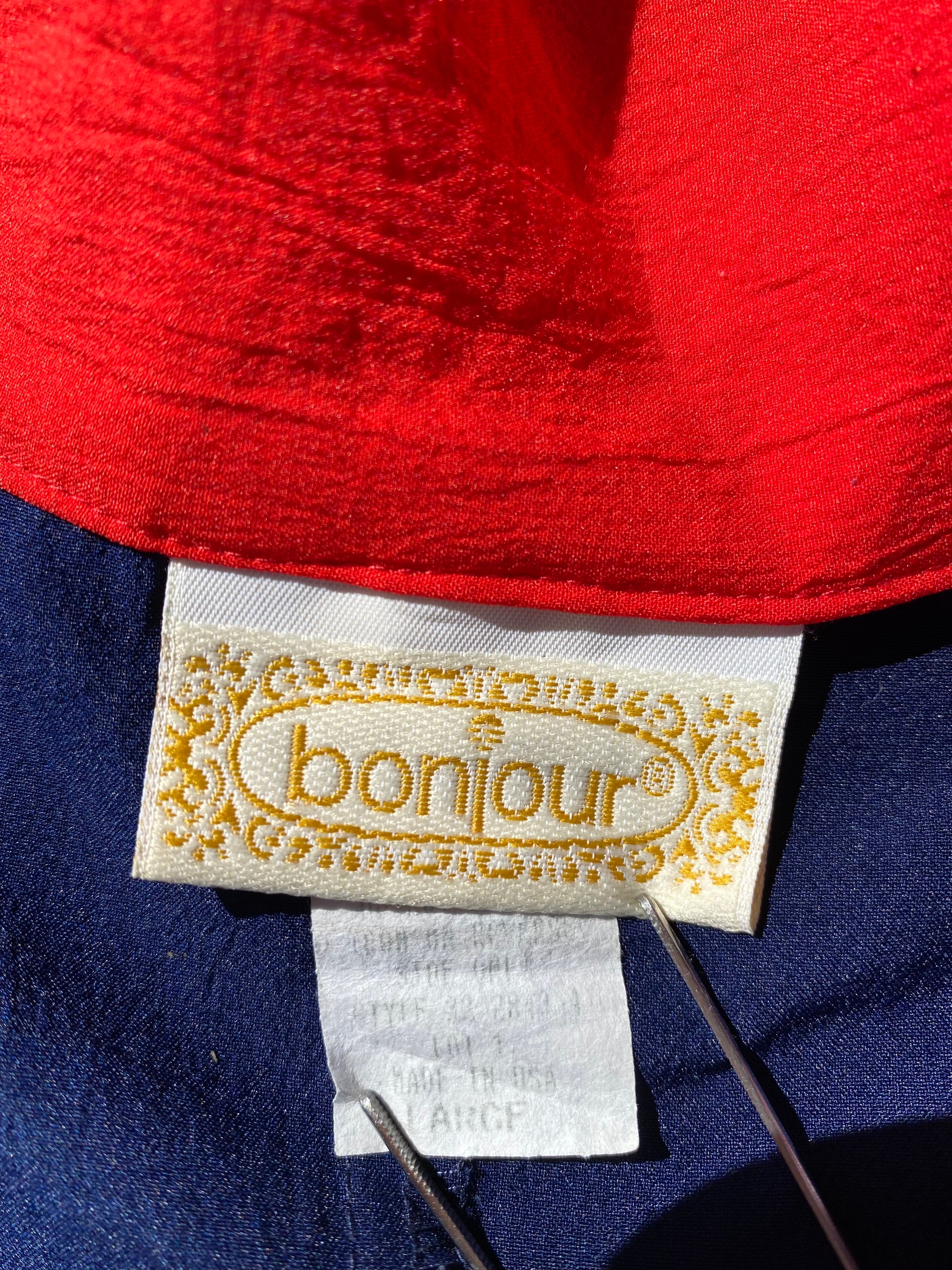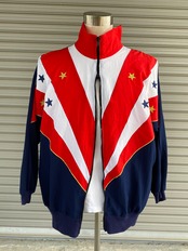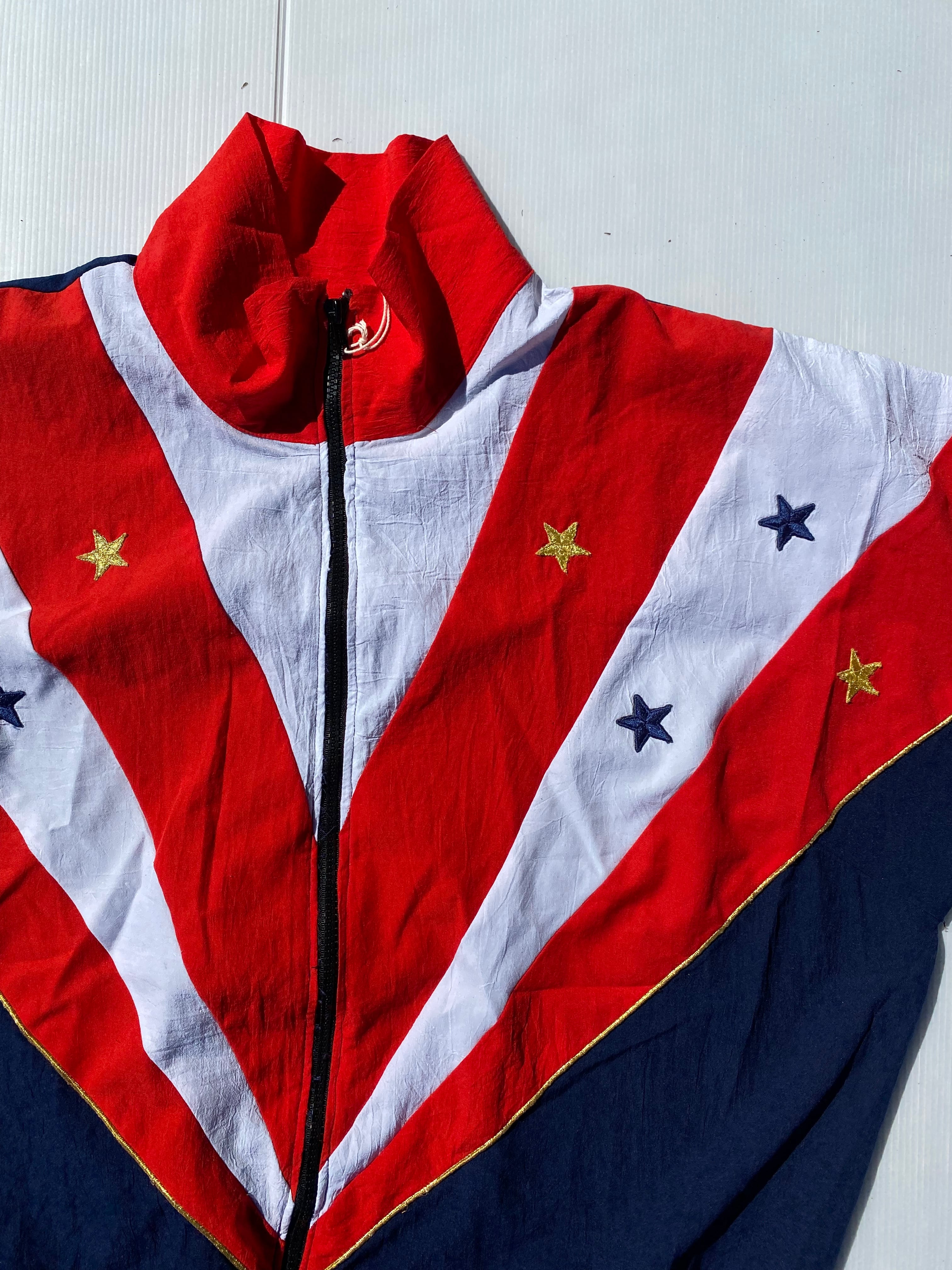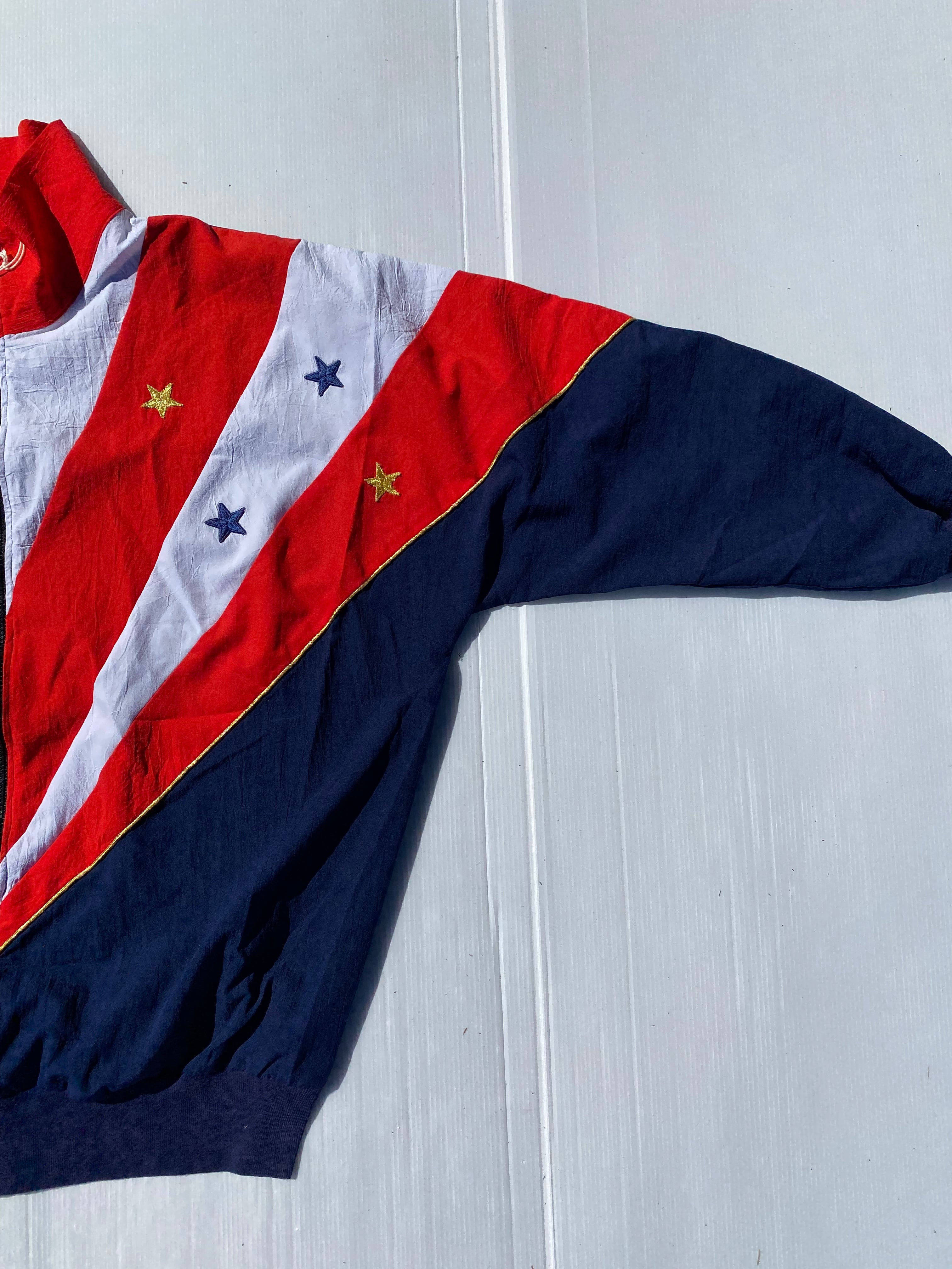 目を惹くトリコロールカラーの切り替えデザイン。スターの刺繍がGOODな星条旗風のデザインが古着らしさ◎