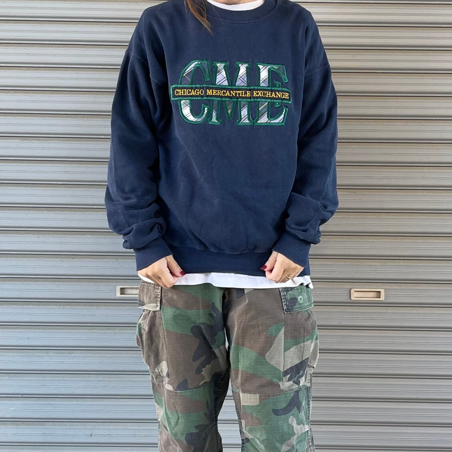 90's USA製 Famous CMECheck Design Sweat. 古着 スウェット 刺繍デザイン ネイビー 紺 L トレーナー