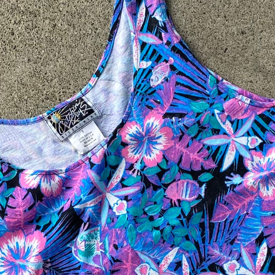 【90's】USA製 トロピカル総柄タンクトップ ブルー×ピンク S 古着 catchin' rays