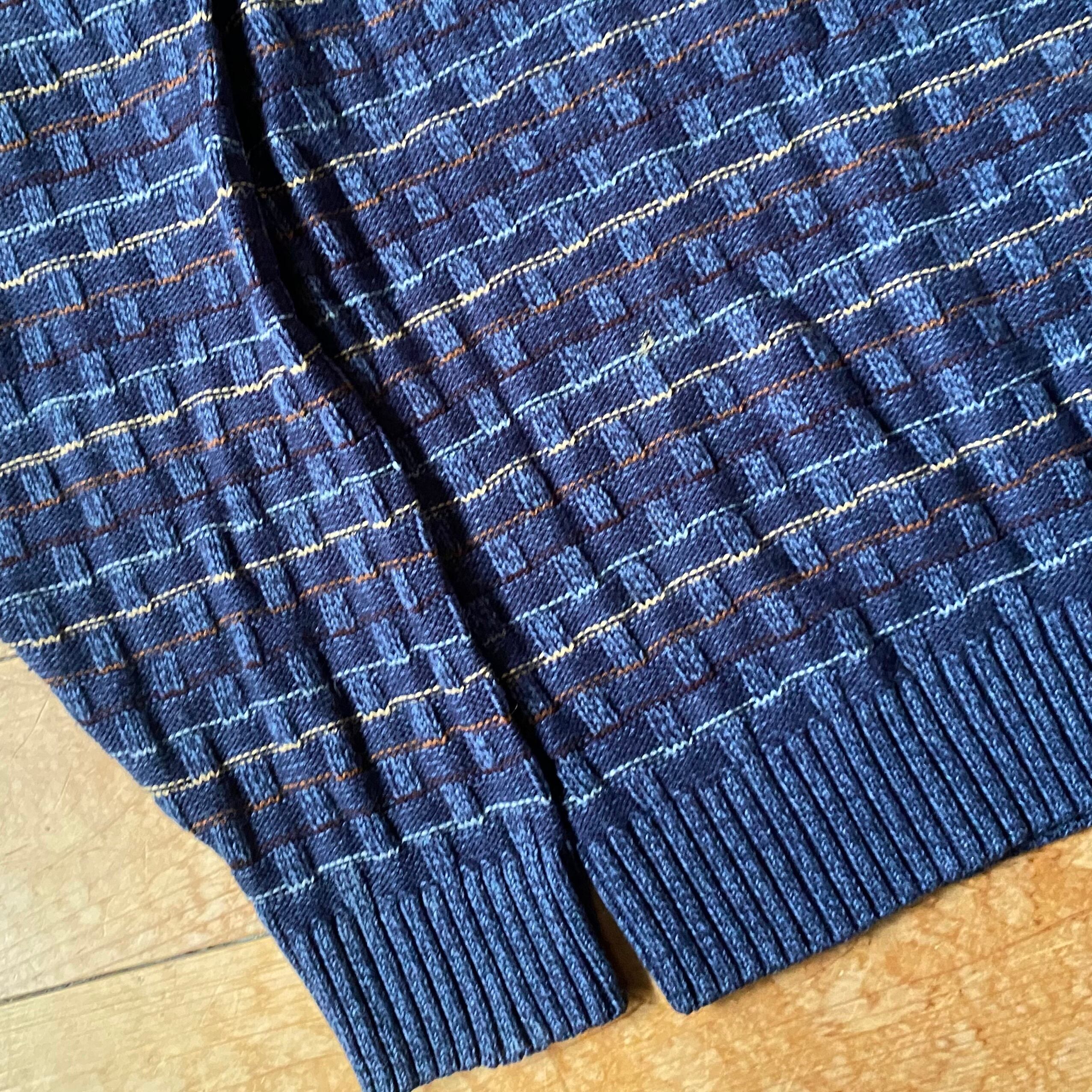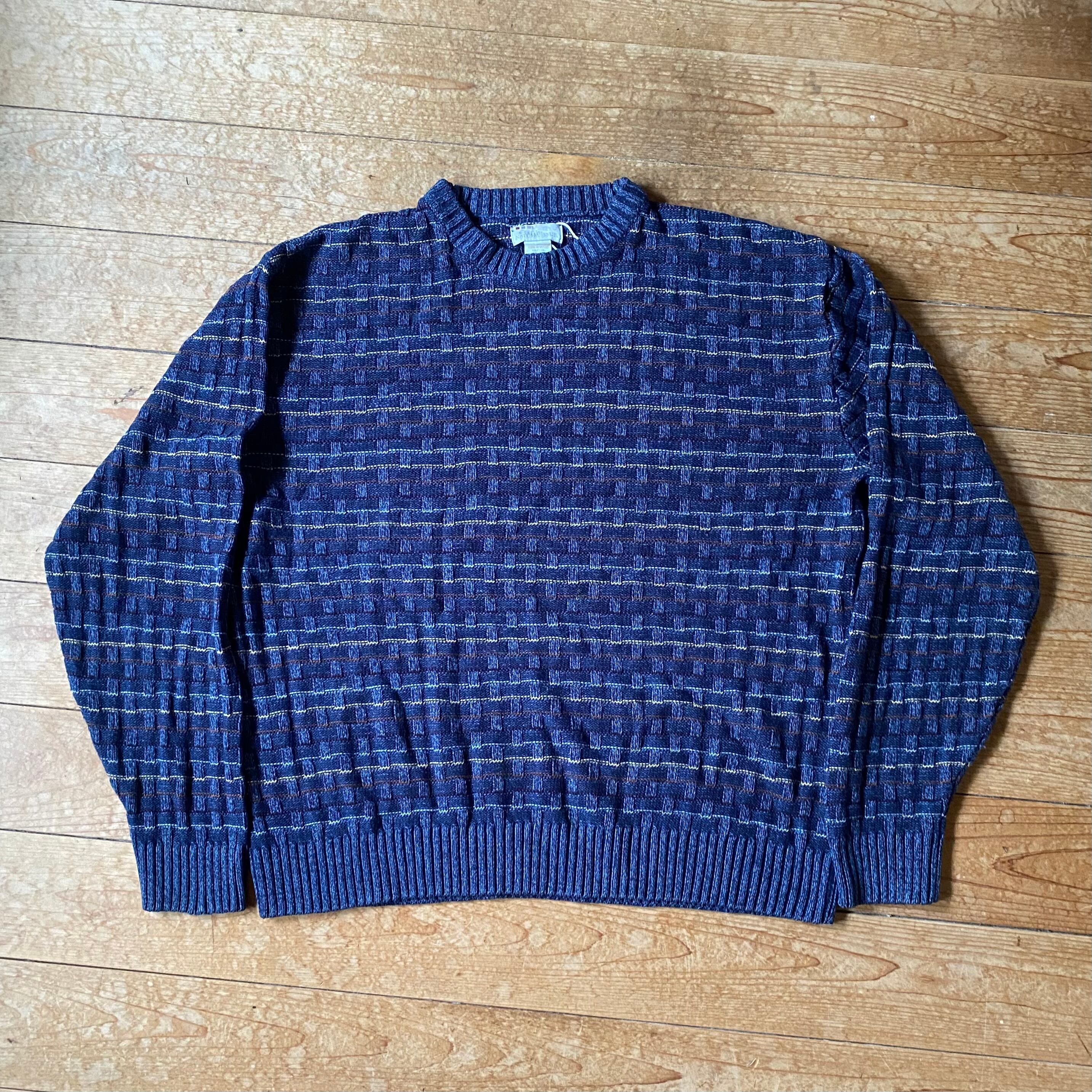 90's natural issue geometric pattern low gauge Knit. 古着 総柄ニット セーター ナチュラルイシュー ネイビー L
