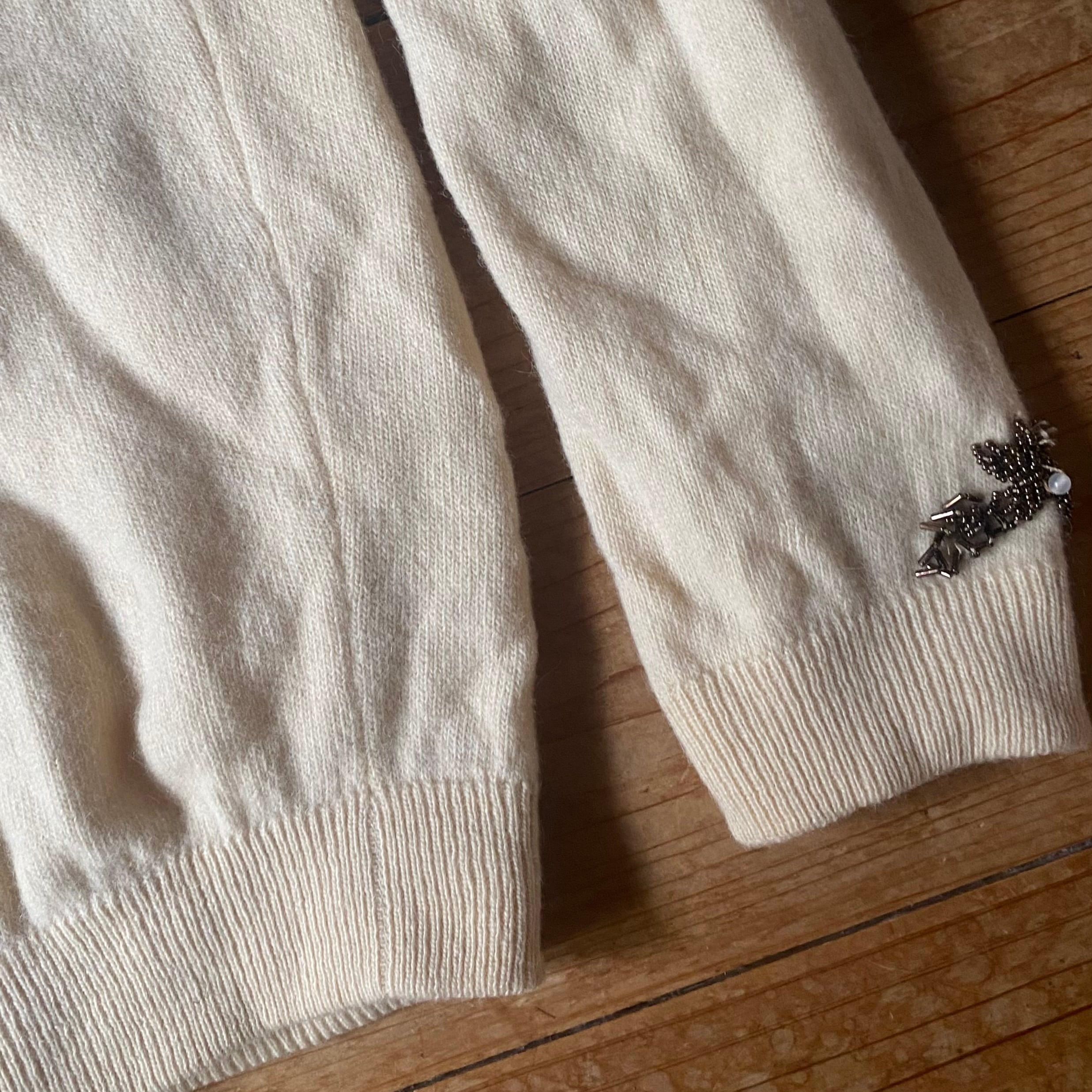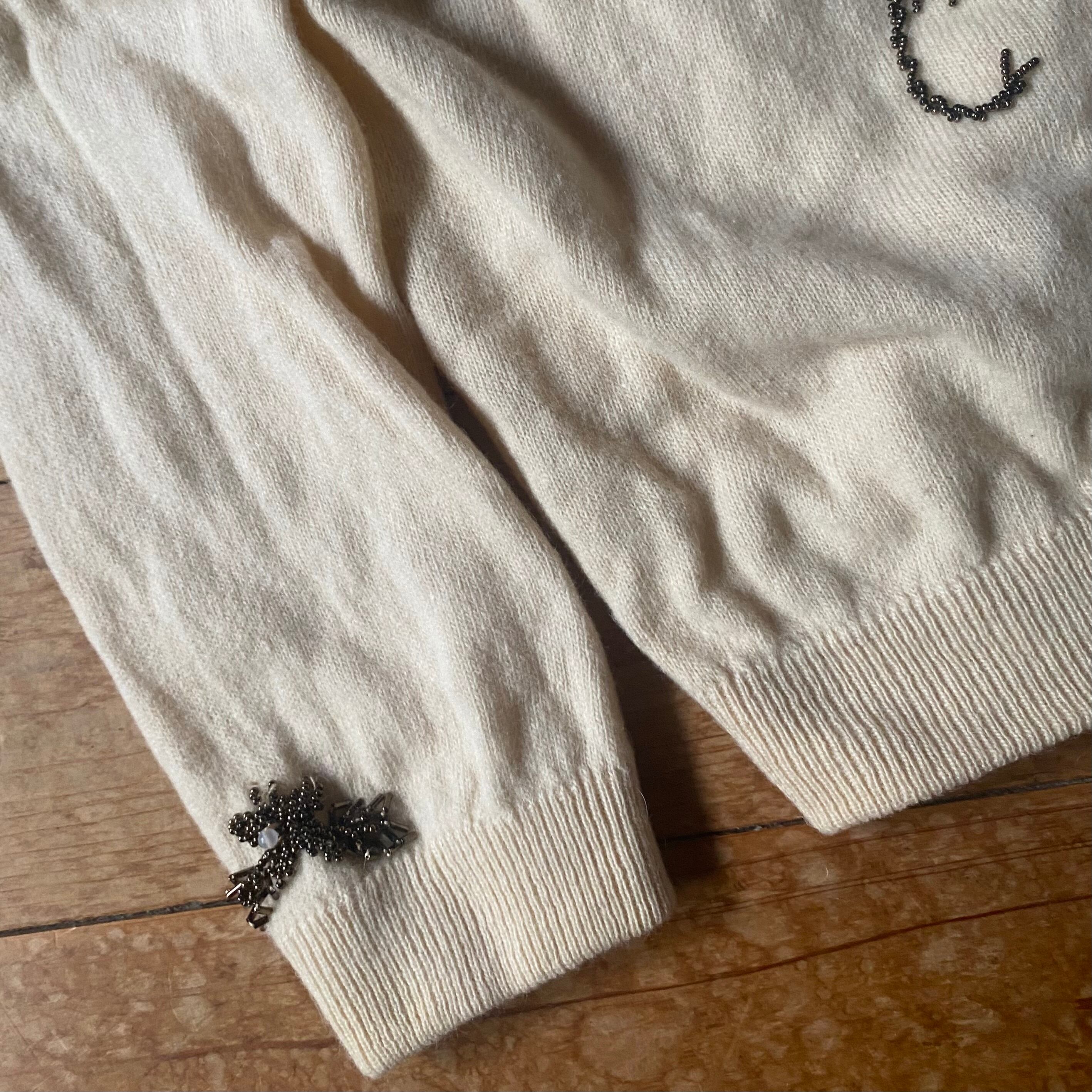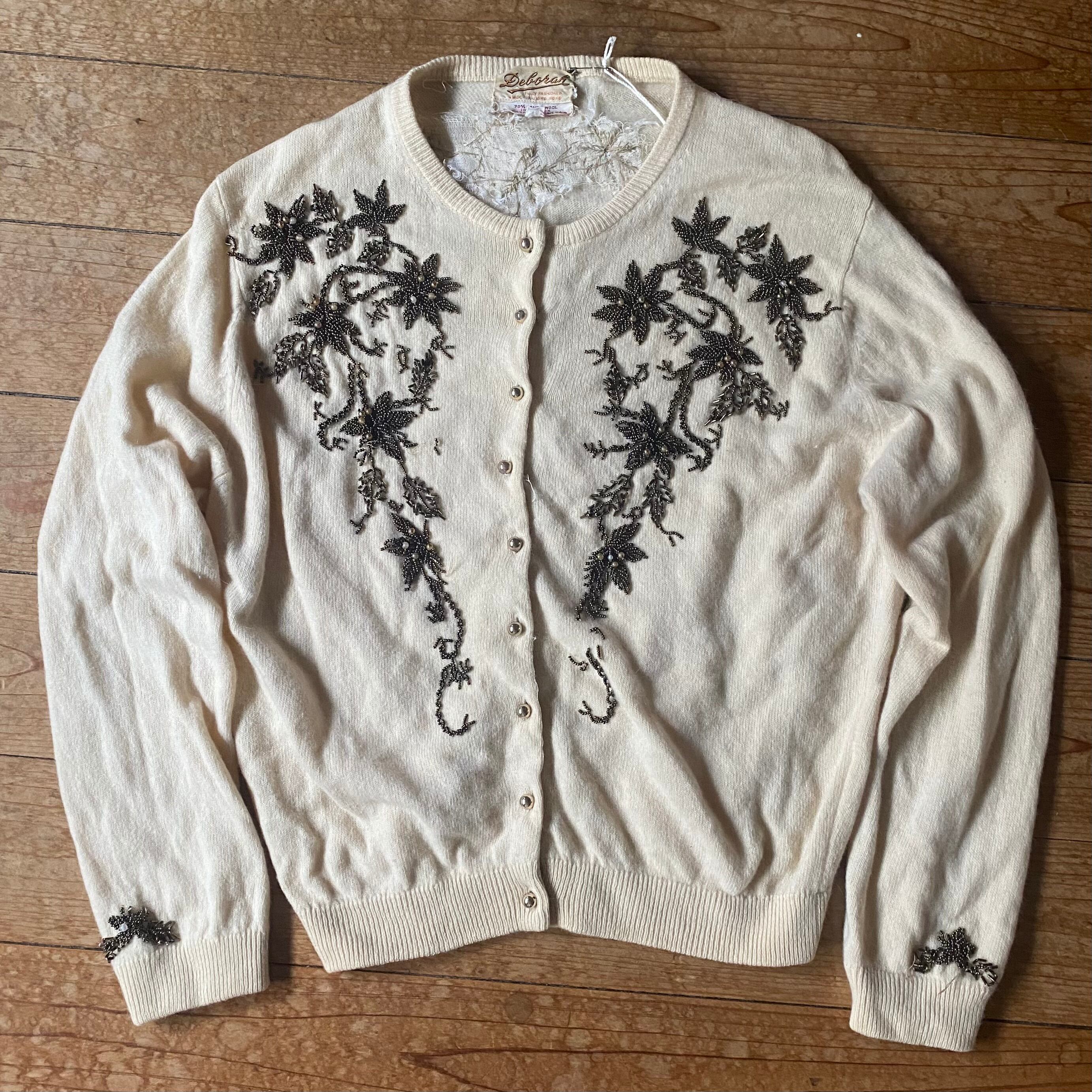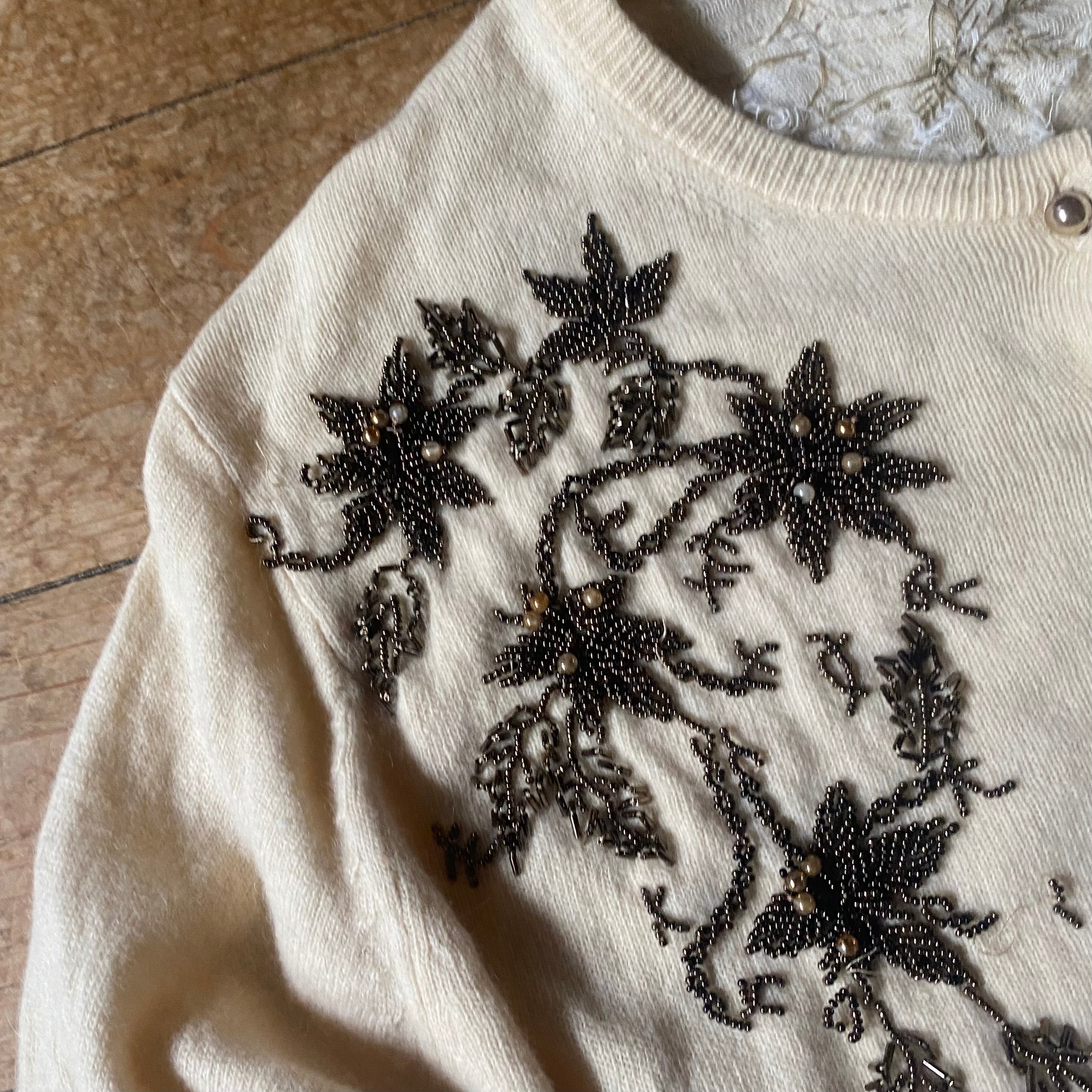 60's vintage bijou pattern knit cardigan. USA古着 ビジューパールボタン クルーネックニットカーディガン オフホワイト 白 ビーズ