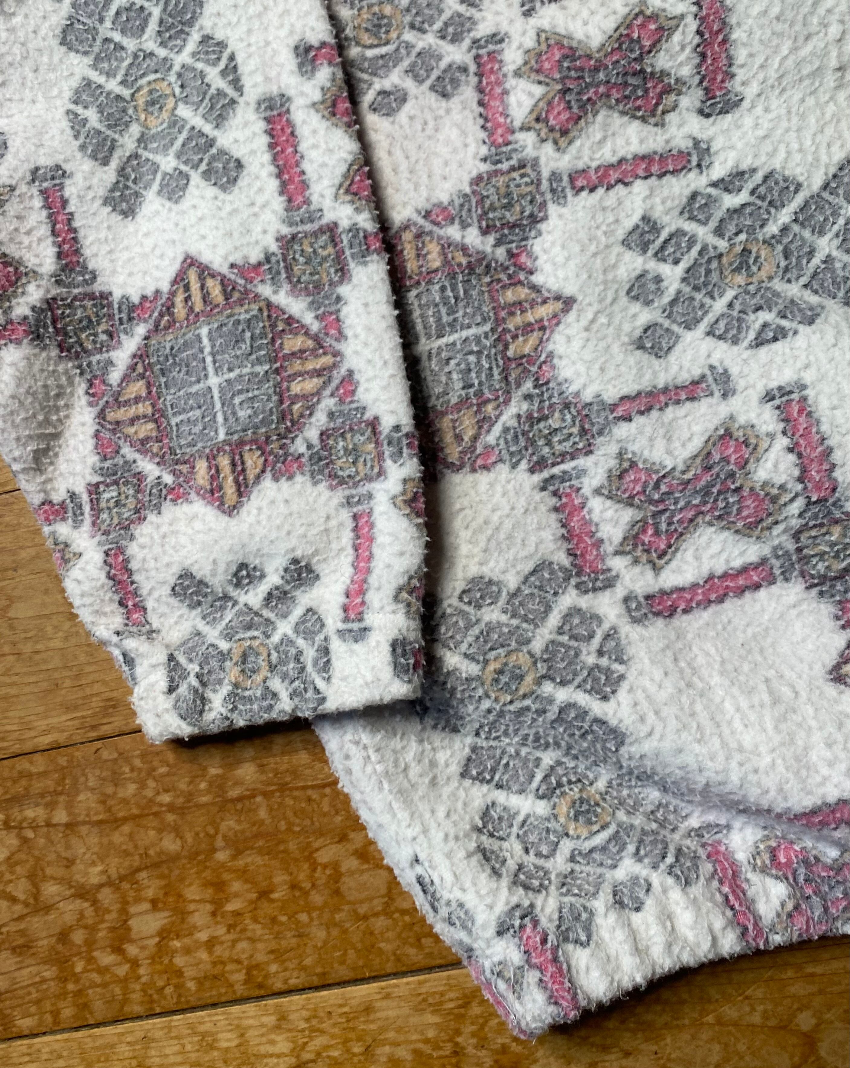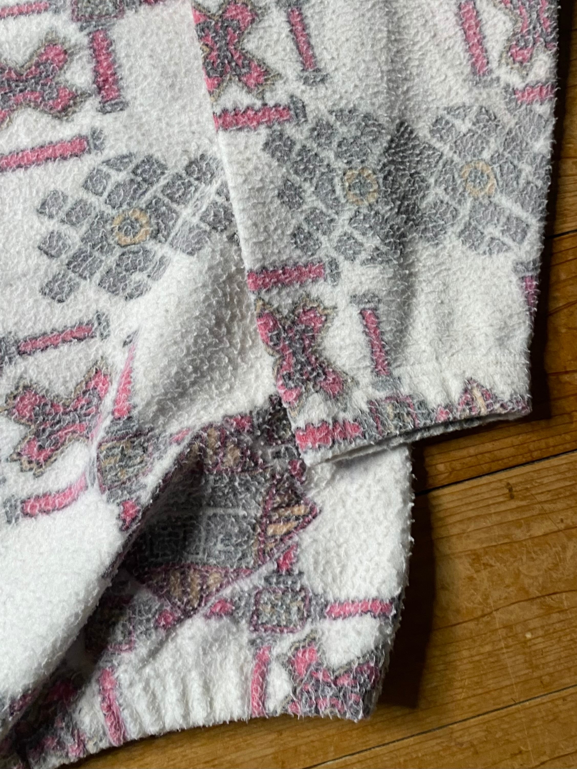 ホワイトベースにグレー×レッドの民族調の総柄フリース。