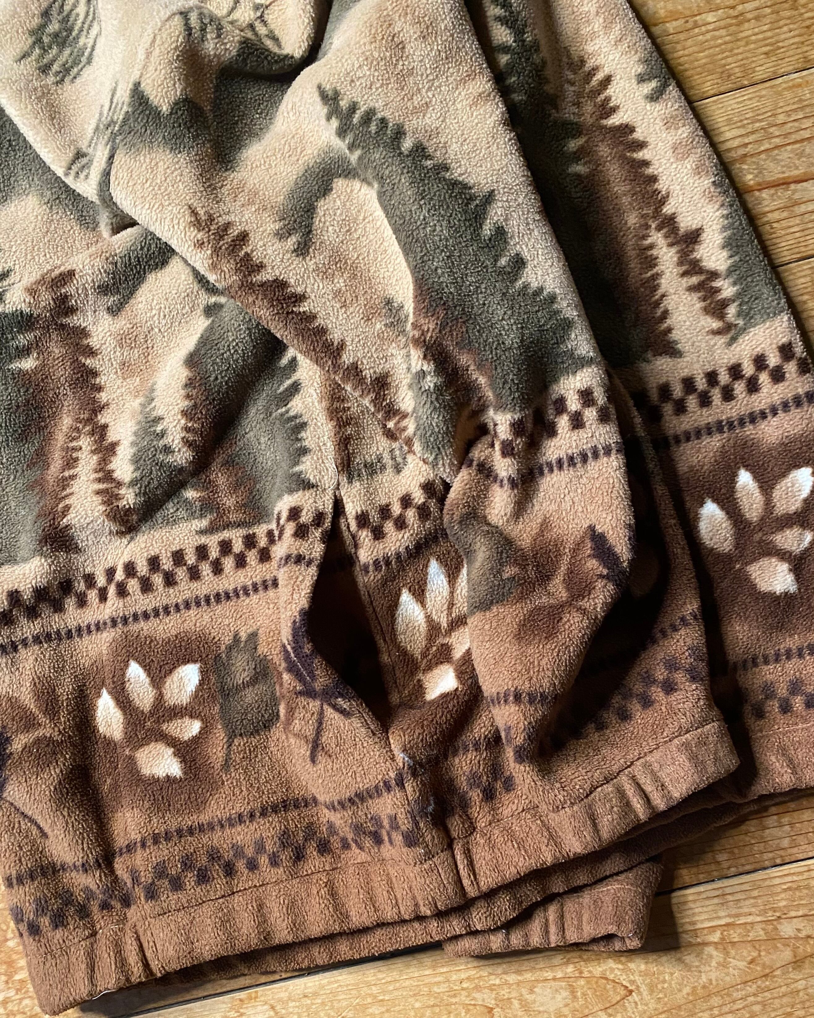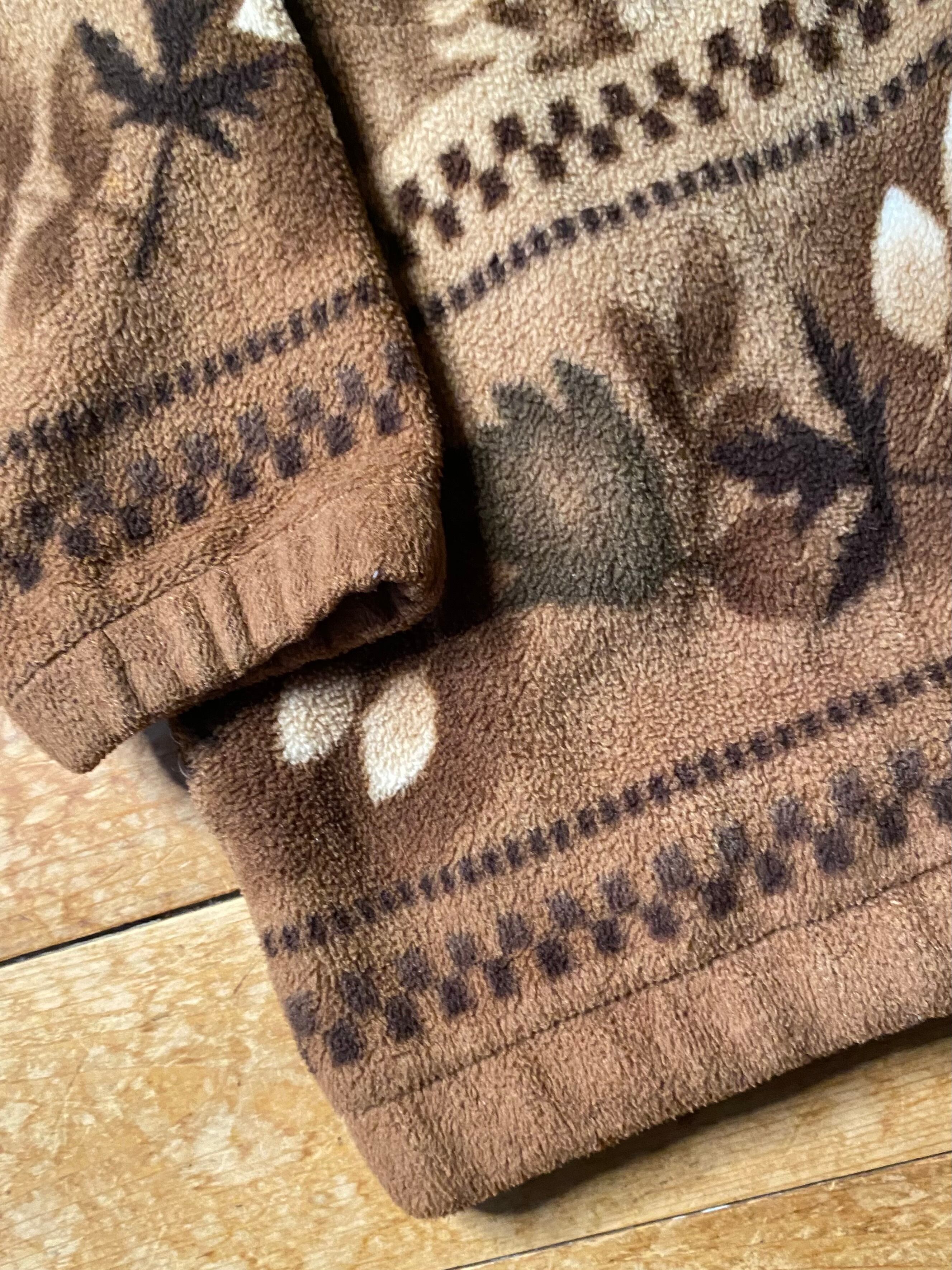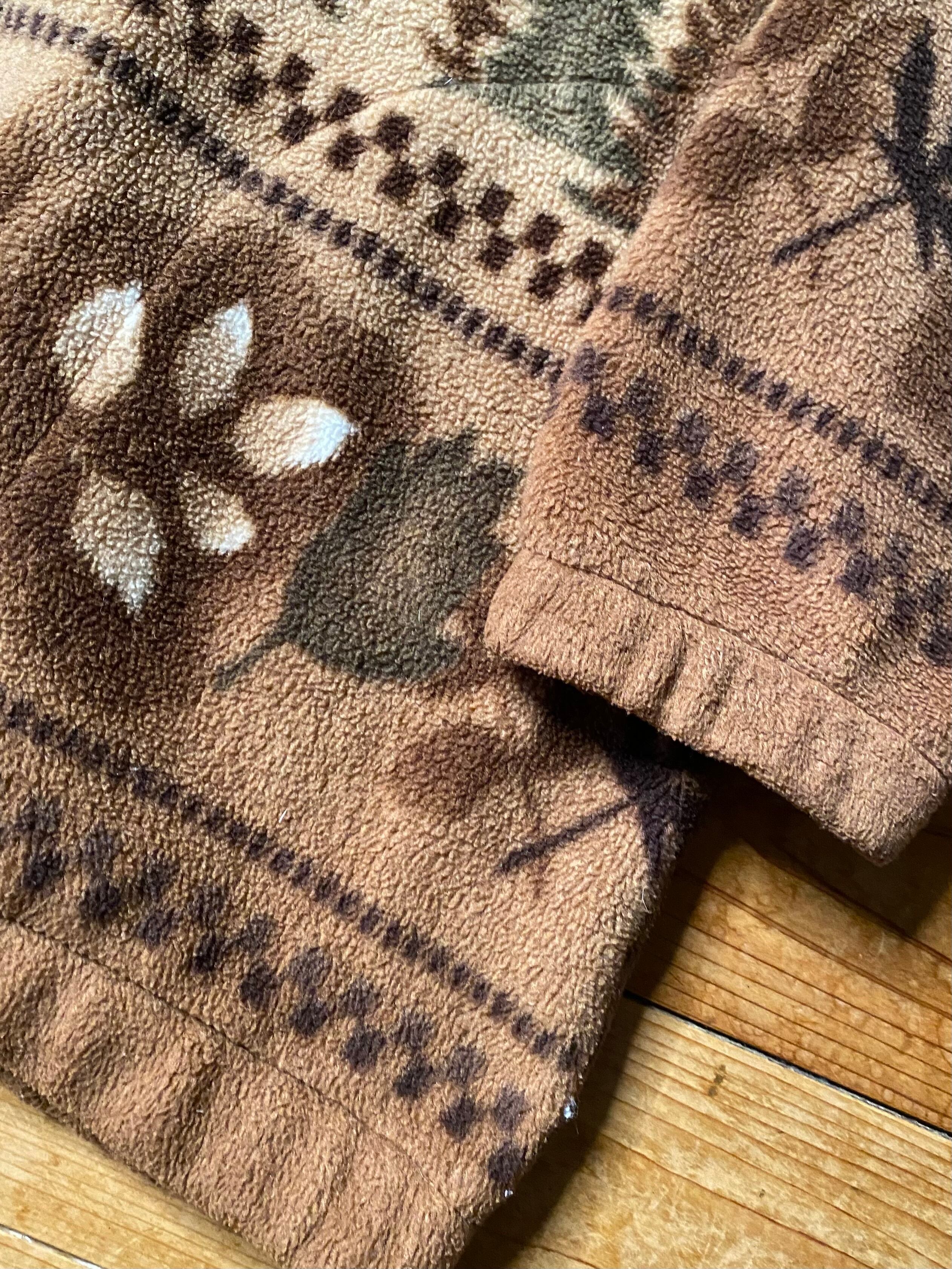 90's 総柄ジップアップフリース ベージュ×ブラウン 古着 ノルディック 木柄