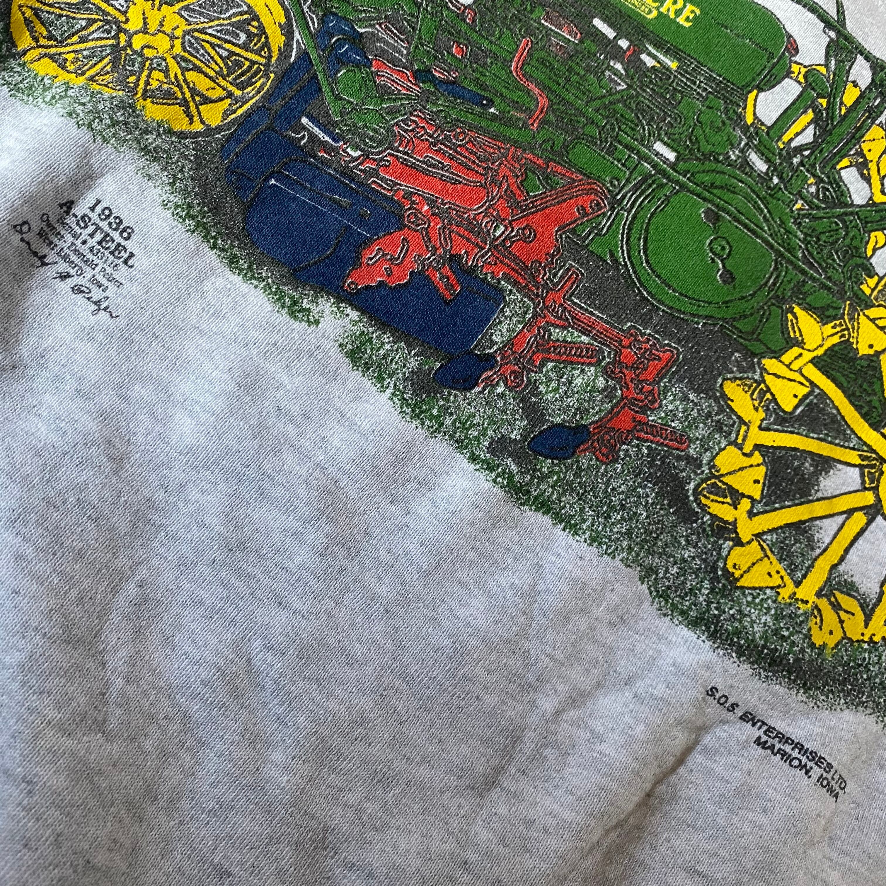 90's USA製 FRUIT OF THE LOOM JOHN DEERE 1936 A-STEEL tractor sweat. 古着 トラクタースウェット 芝刈り機 ジョンディア グレー XXL