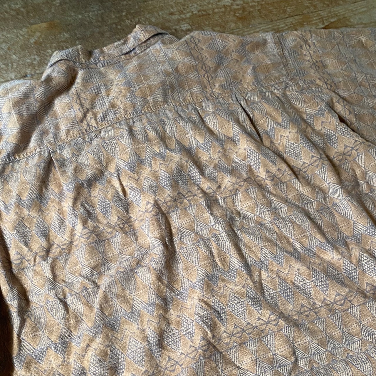 柔らかな印象のブリックカラーに同色系のネイティブな総柄シャツ。